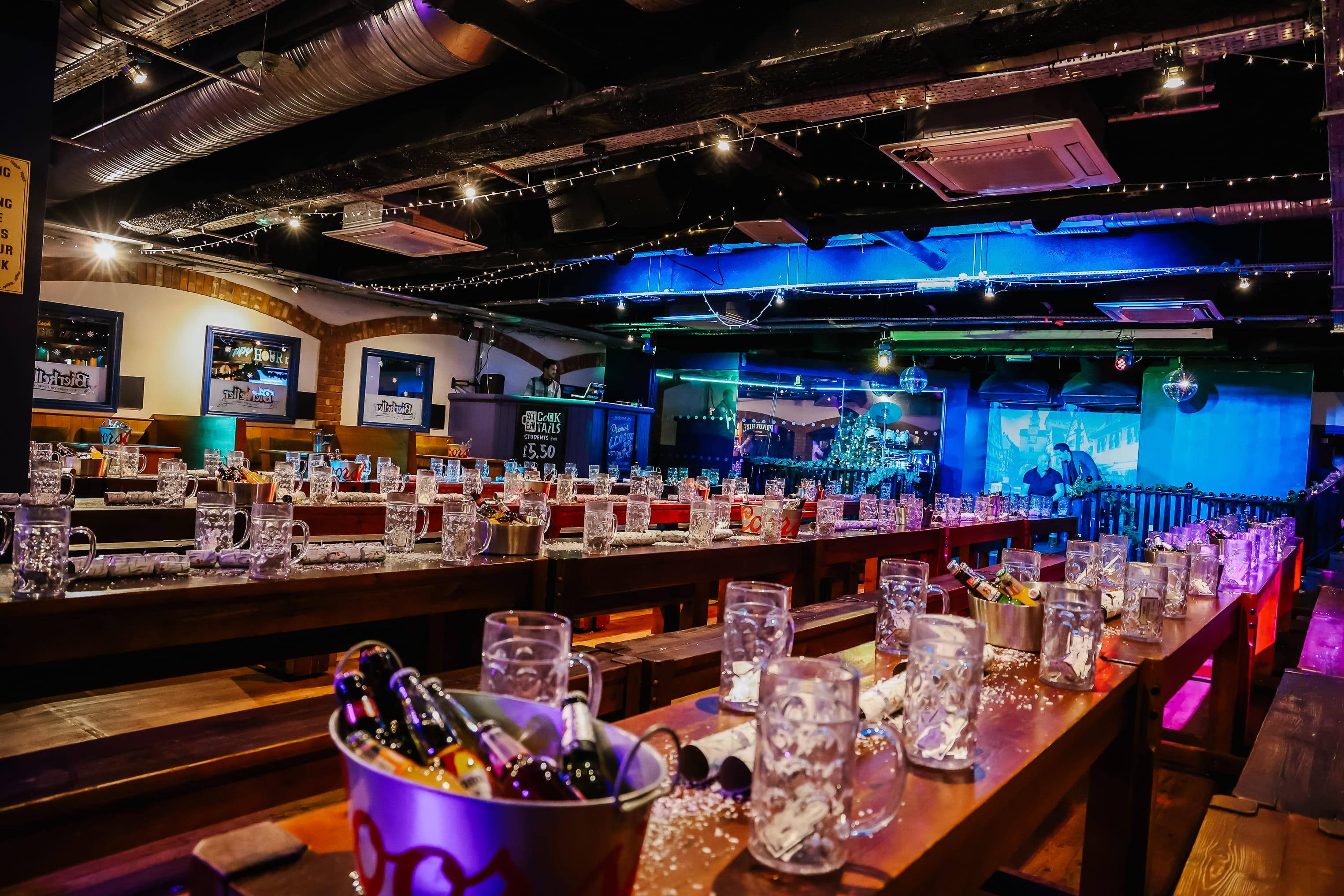 You’ll find The Bierkeller right in the heart of Manchester's City Centre and situated in middle of The Printworks; Manchester’s notorious premier entertainment district. We’ve got four different sized rooms spread out across two floors, where we can serve food and drink every day of the week. This is our signature Bavarian-themed Bierkeller Bar room and is where we host our weekly sold out Saturday Night - Oompah Show. Inside there we can hold up to 350 people sittings and standing. Surrounding the room we have 2x large HD television screens and 1x large projector screen. We also have an exclusive stage area to host, present or even perform from. Not forgetting our exclusive large bar area to cater for all your food and beverage needs. We also have plenty of A/V equipment available on request, to always make sure we cover all event types at The Bierkeller.