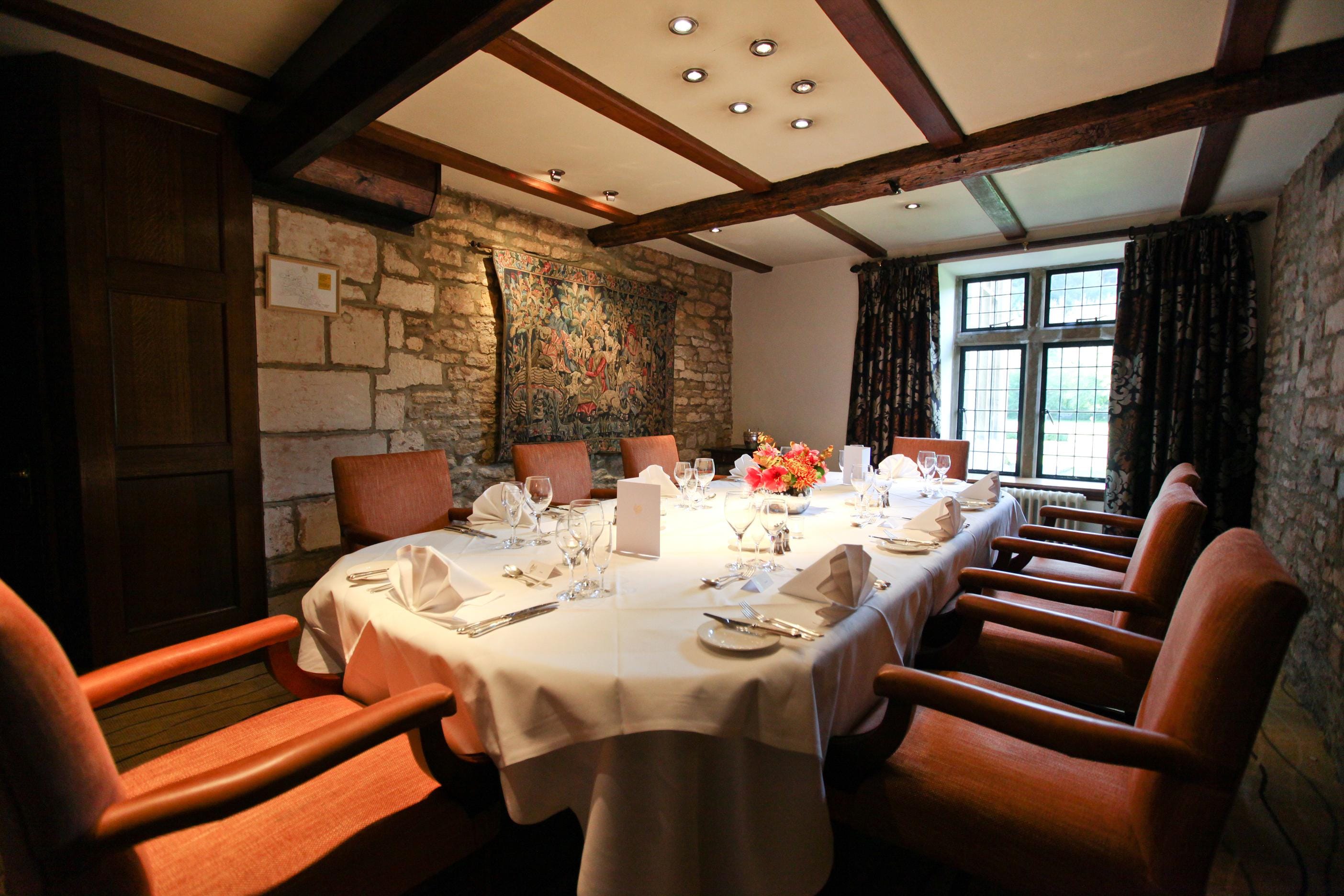 Nestled alongside the Saxam with interconnecting doors, the Gorges is slightly smaller yet still boasts a grand oak table, beautiful stained glass windows and views over the lawns and beyond. Ideal for small formal boardroom meetings and for also entertaining dinner guests in a private room.