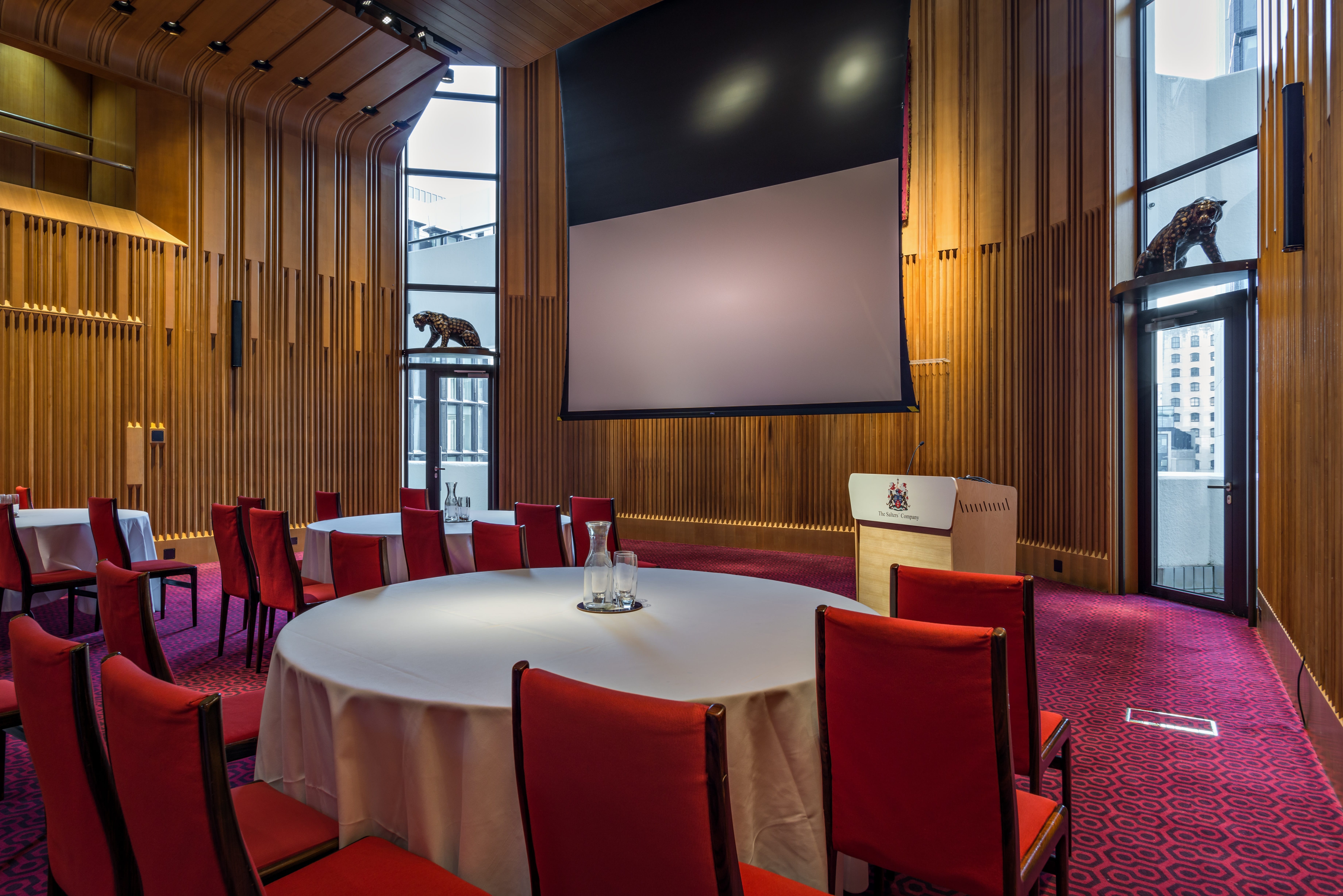 Our elegant Main Hall has stunning high ceilings, fluted ash panels and deep red carpets. The space is adjacent to the reception space in the Court Room and in conjunction is ideal for conferences, meetings, receptions, parties, dinners, filming, product launches and many more types of events.