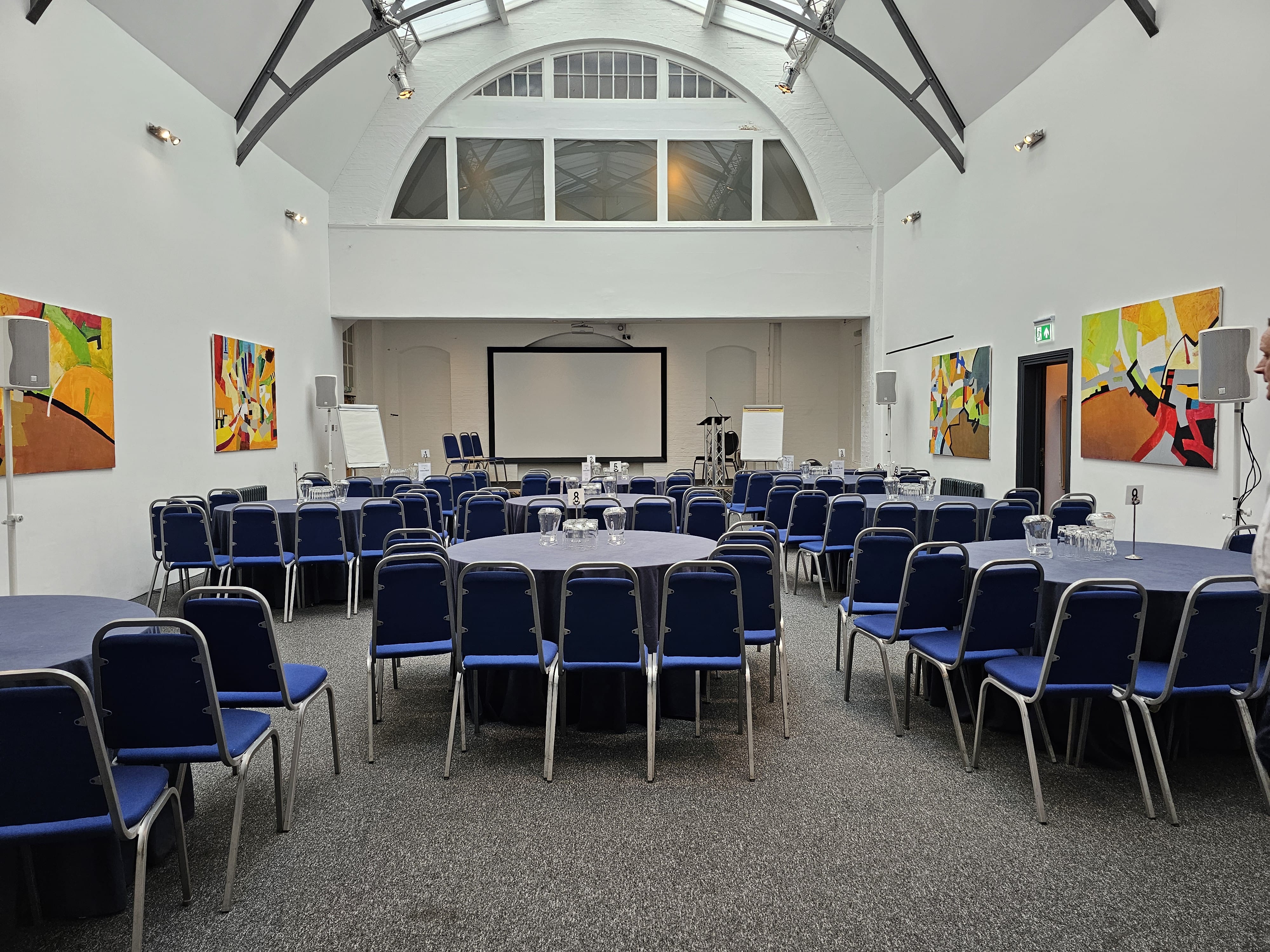 Every room inside Mary Ward House brings its own creative touches, but the Brewer & Smith Room is perhaps the most unique. Delivering an exceptional level of natural light and spectacularly high ceilings, it’s nestled within the lower ground floor of the building, creating a singularly quirky conference venue in London. Hardwood parquet floor lends the room a prestige air that harkens back to the building’s 19th century roots, but it is undoubtedly the ceiling that will enduringly capture your attention. Though on the lower ground roof, the ceiling of the Brewer & Smith Room arches gracefully across the width of the room. Windows set along the centre allow sunlight to pour in from above, with dramatic metal rafters complementing the pure white of the room’s walls