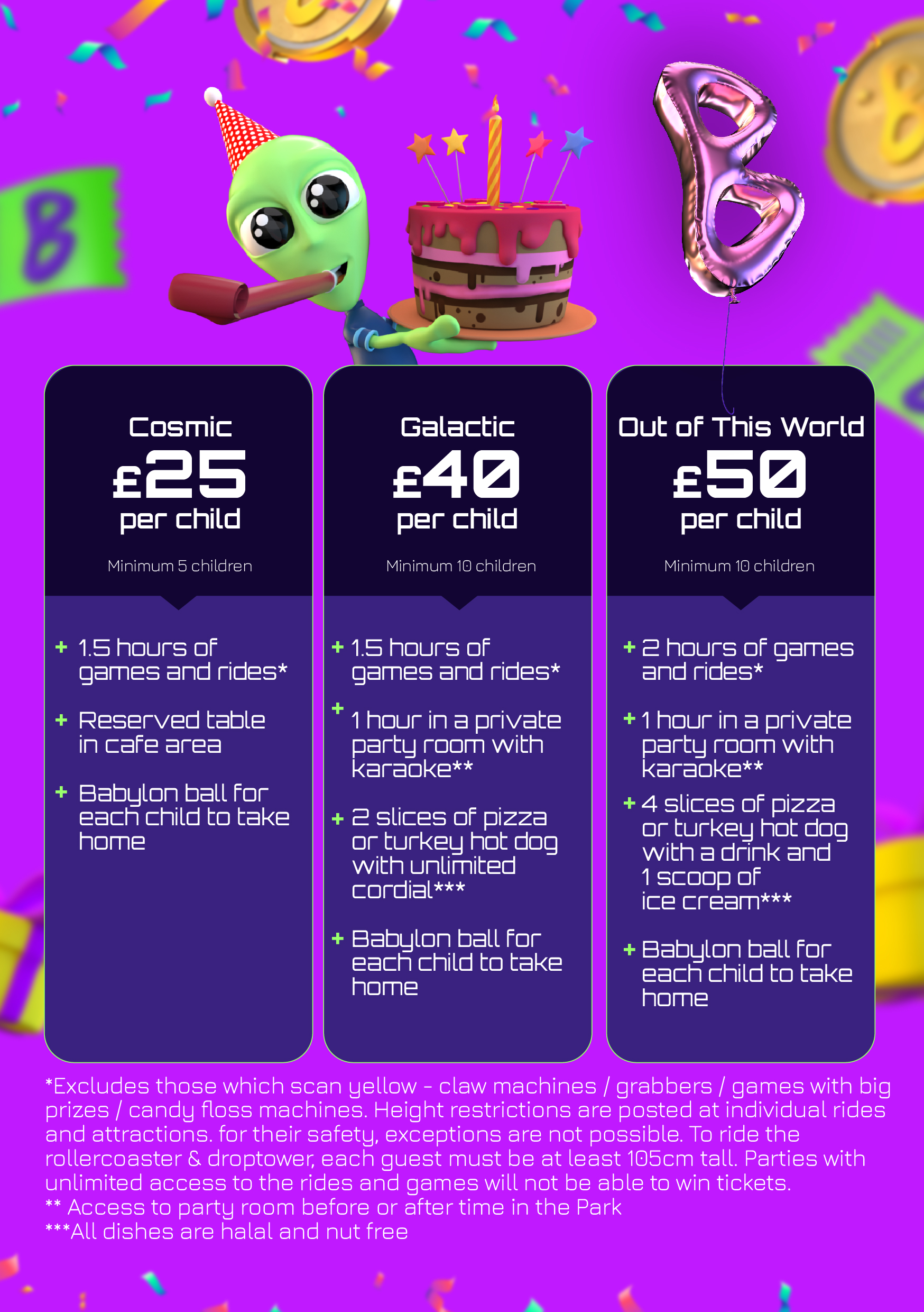 Welcome to Babylon Park Camden, London’s most exciting indoor intergalactic adventure park — a neon-lit world of rides, arcade games, and cosmic fun for all ages! 🌌 Located in the heart of Camden Market (8–10 Castlehaven Road, NW1 8QU) — just a short walk from Camden Town Underground Station — Babylon Park offers three floors of thrilling rides, immersive games, and themed party spaces perfect for unforgettable birthdays. 🚀 🎉 Birthday Party Packages Whether you’re planning a small celebration or a full-blown space adventure, we’ve got the perfect package for every age and budget: 🪐 Cosmic Party – £25 per child - 1.5 hours of unlimited rides & arcade games - Reserved table in our mezzanine café - Babylon birthday ball for each child to take home ✨ Perfect for younger kids or smaller groups looking for maximum fun in a shorter time! 🌠 Galactic Party – £35 per child - 1.5 hours of unlimited rides & arcade games - 1 hour in a private party room with karaoke - Choice of pizza or hot dog meal + unlimited cordial - Babylon birthday ball for every guest 🎤 Great for kids who love to sing, play, and celebrate in style! 👽 Out of This World Party – £50 per child - 2 hours of unlimited rides & arcade games - 1 hour in a private karaoke party room (after park time) - Main meal, drink, and ice cream dessert for each child - Babylon birthday ball for every guest 💫 The ultimate VIP experience — food, fun, and endless adventure! 🌟 Why Choose Babylon Park? 🕹️ Unlimited fun under one roof — rides, games, karaoke & food! 👨👩👧👦 Perfect for all ages — toddlers to teens (and grown-ups too!) 🌈 Immersive space theme — glowing lights, friendly aliens & cosmic vibes 🍕 Tasty halal party food — pizzas, hot dogs, desserts & more 🌧️ All-weather venue — completely indoors, so the party never stops 🚇 Amazing location — in Camden Market’s Hawley Wharf, minutes from the Tube 🏰 Park Highlights - UK’s only underground rollercoaster 🎢 - Drop Tower, Bumper Cars, Kiddie Wheel & more - VR experiences, arcade games, and soft-play zones - Mezzanine café for snacks, meals & drinks - Private karaoke rooms for unforgettable parties - Friendly Human Helpers to make your day smooth & stress-free 🎯 Good to Know - Minimum party size: 10 children | Maximum: 40 - £10 deposit per child required to secure your date (non-refundable) - Height restrictions apply (min. 105cm for Rollercoaster & Drop Tower) - Outside birthday cakes and decorations welcome in the party room 🎂 - Adults welcome to stay, supervise, and join the fun (coins available for rides & games)
