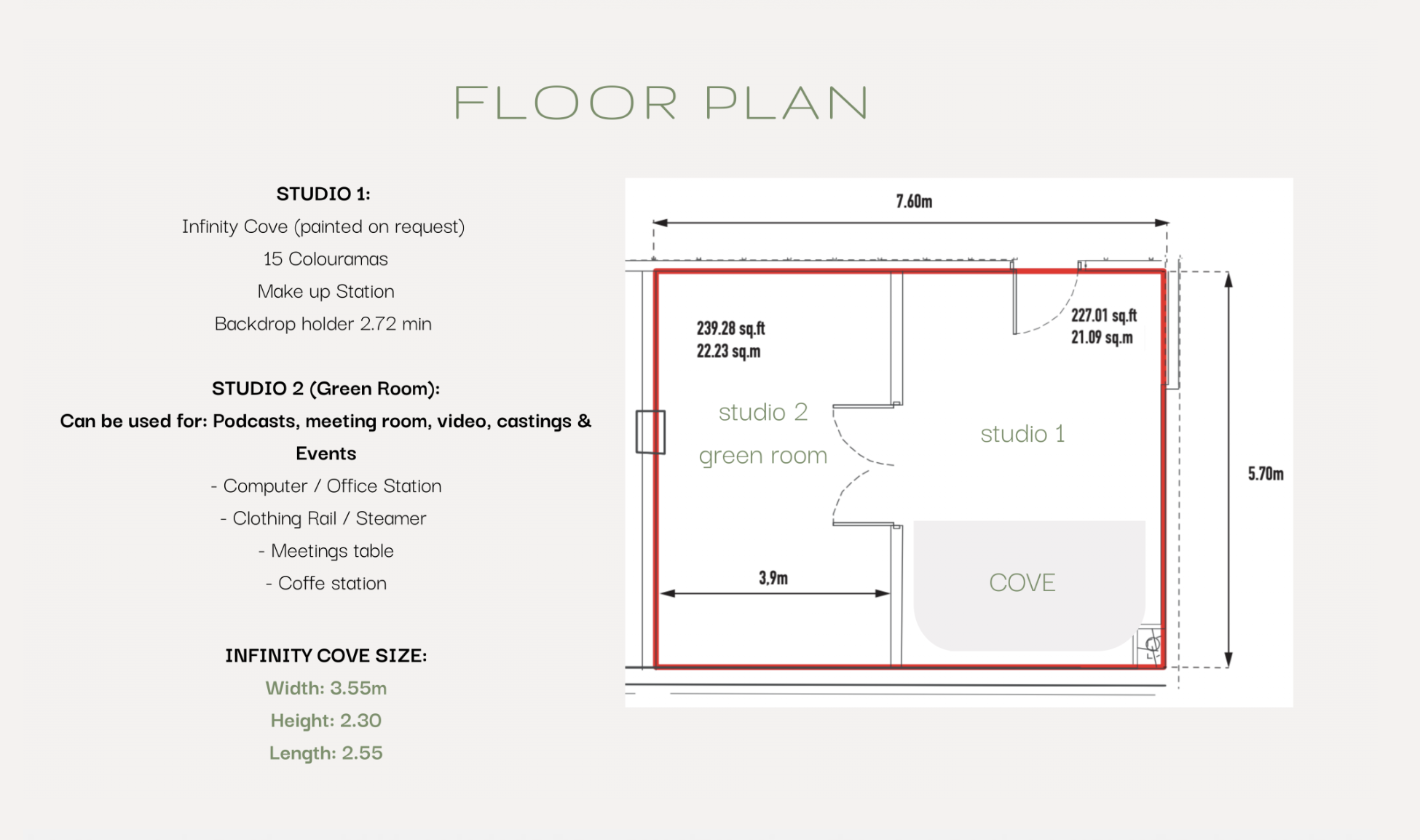 SL Creatives studios fits the needs of every creative from a photographer, producer, stylist, assistant and client in mind, we strive to offer each hire a professional and functioning workspace equipped with all the essentials! We offer an additional hire option (included in the studio hire prices) of our beautiful green room (studio 2), next door that can be used as a second studio, podcast, castings, meeting room, video hire & events. INCLUDING 1 x light mirror 1 x full length mirror 1 x steamer 2 x rails RALENO Professional Softbox Lighting Kit: 2 x Softbox Reflect Diffuser Panel 2 x 78.7” Umbrella Flash Light Shelf 2 x84W CFL E27 Socket 5500k bulbs 2 x White soft cover 1 x Neewer 660 PRO RGB LED video light 2 x Polyboards 2x continuous lights Colorama We have a variety of colours available enquire for details We charge £10 for use of coloramas and an additional £10/m that isn't as new after use.