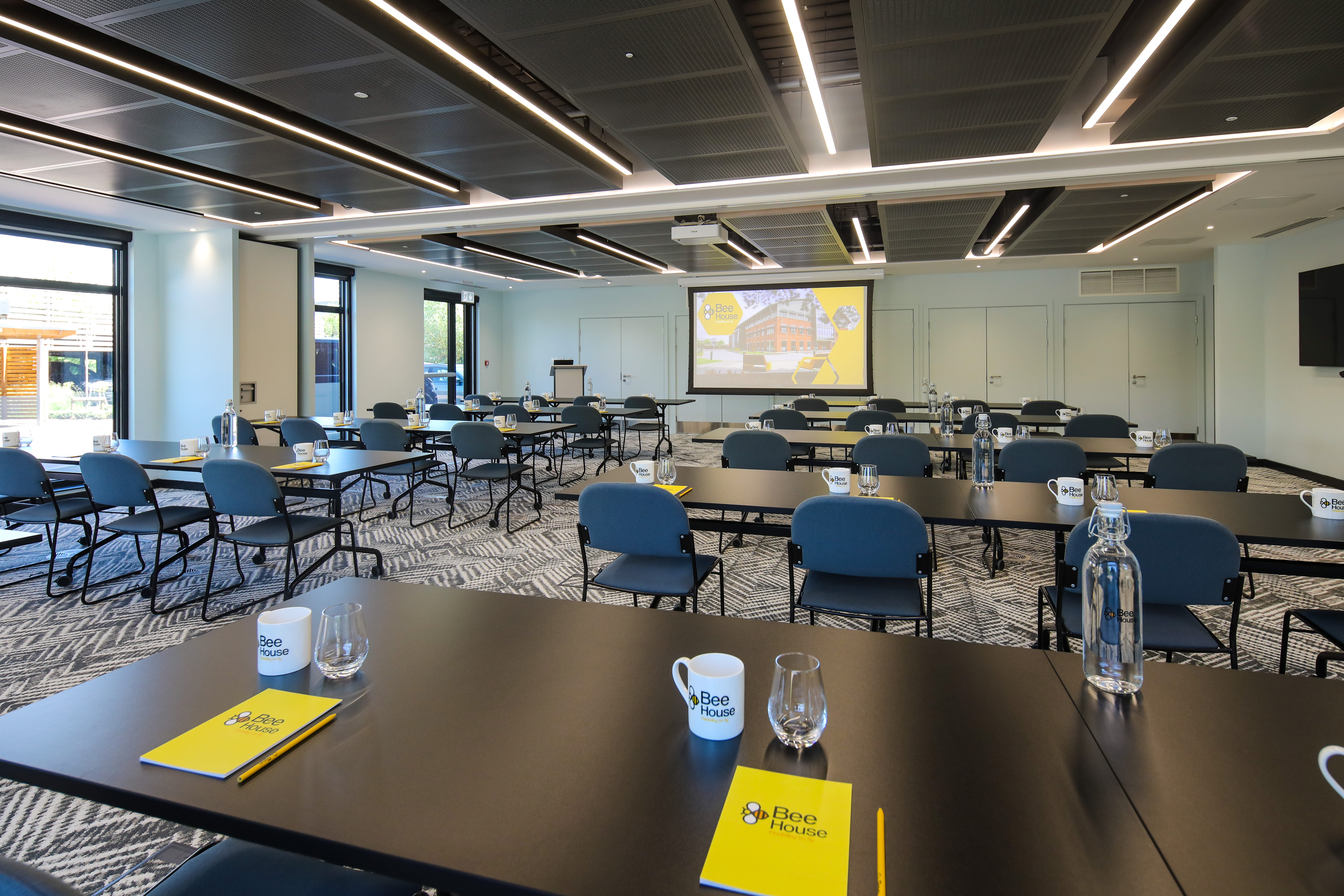 The Buzz is a 145-seat conference room (theatre style), alternative layouts available. Facilities include AV equipment, wireless ClickShare connection and stationery. Available on request, flipcharts, lectern, microphones and catering from our on-site service provider. Included with The Buzz is the use of the B-Lounge hospitality suite where delegates may help themselves to hot & cold beverages and biscuits.