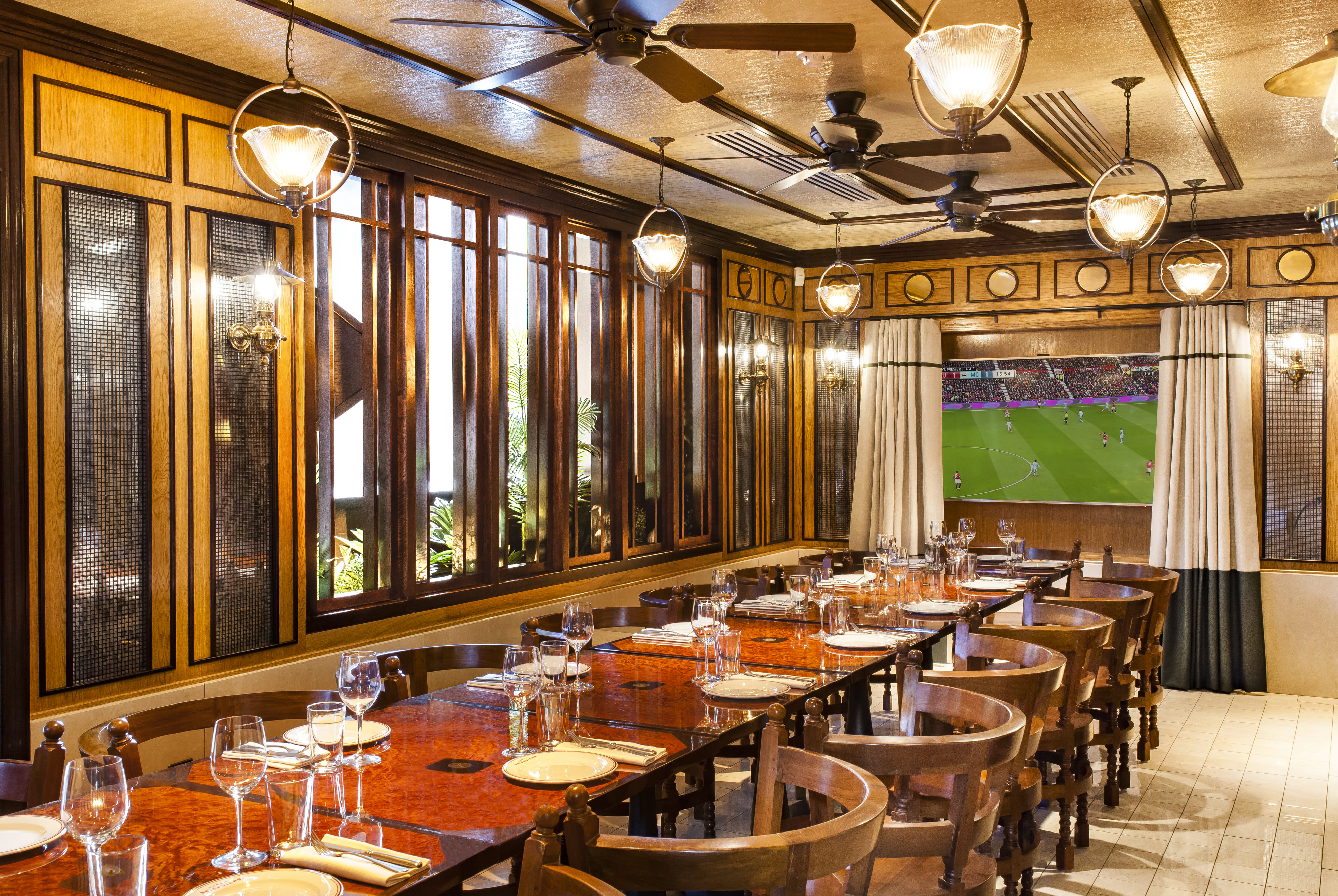 The Pot Luck Room is a relaxed space connecting into the Brigadiers Dining Room, offering both private or semi-private dining options. The glamorous conservatory features slow tuning old world ceiling fans, stone tiled flooring and planting and mirrors to create an illusion of space. It also boasts a number of features to enhance your experience at Brigadiers, including a Bottoms-Up Beer dispenser allowing you to serve your own pint in just 4 seconds.