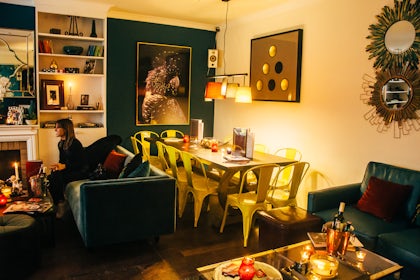 Our Living Room and Kitchen area are designed to bring you all the comforts of a party at home, without having to clean up anything afterwards! Full of natural light and vibrant furnishings, the space is ideal for laid-back dining and drinking for groups of up to 60 people. This area can be hired privately until 9.30 pm or as full venue hire.