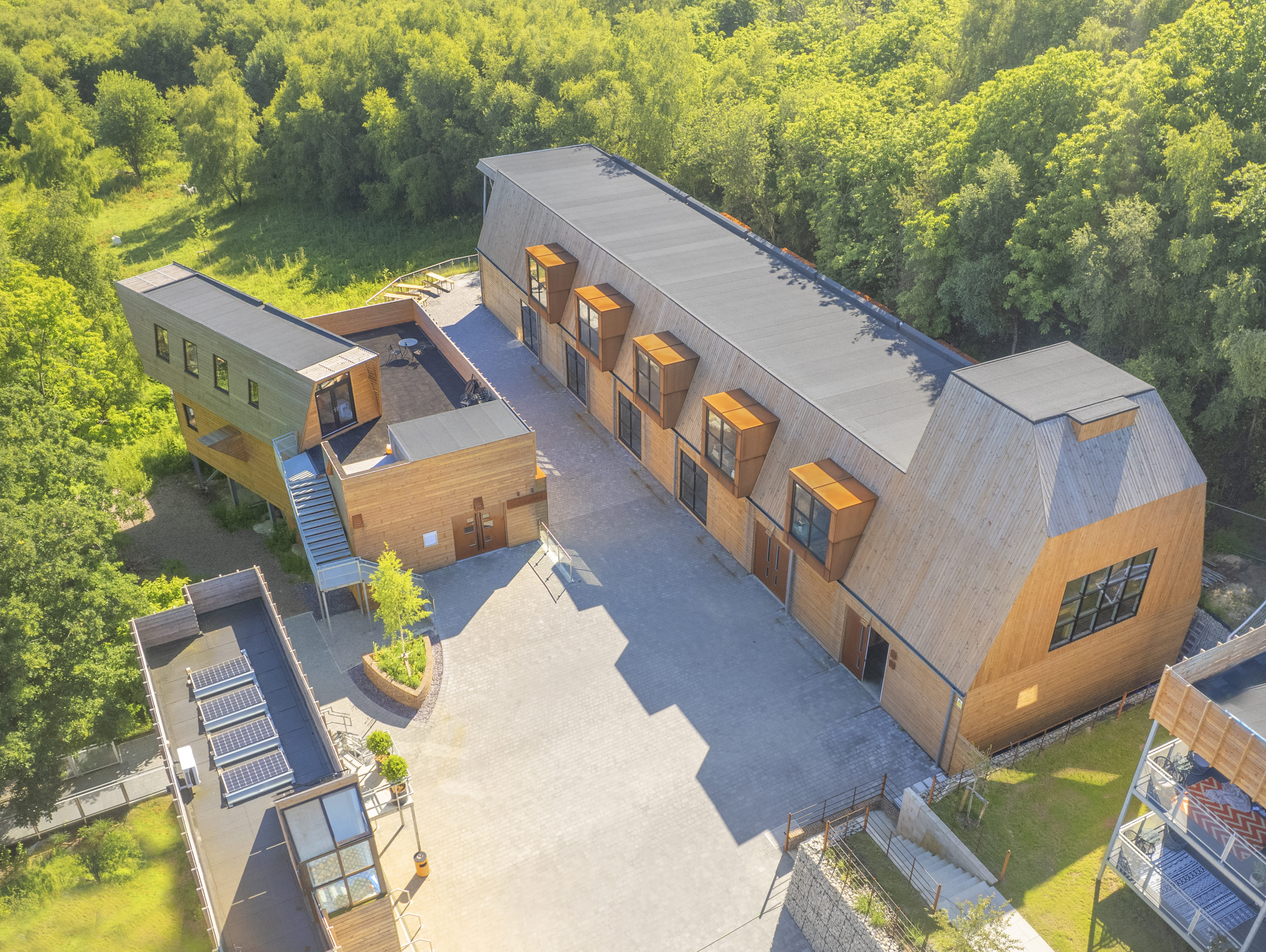 Set in an Area of Outstanding Natural Beauty in the Village of Flimwell on the East Sussex border with Kent, Flimwell Park has been designed to connect people with its woodland surroundings. The aim is to enhance the wellbeing of the community that will live, work and visit us, whether that will be to work in one of our all-timber workspaces, enjoy lunch at our restaurant-café, walk in our woodland, or host a function. The primary event space, the Focal Building, is a large timber frame structure with external corten steel accents. Often described as a wooden cathedral, the Focal Building offers up to 330m2 of open plan space with dedicated toilet facilities. Hire of the Focal building includes access to the ancient woodland and the on-site restaurant, Birchwood, can offer catering at an additional cost. The site has 10 subterranean Lodges that can be hired, which comfortably sleeps two but as many as three per Lodge.