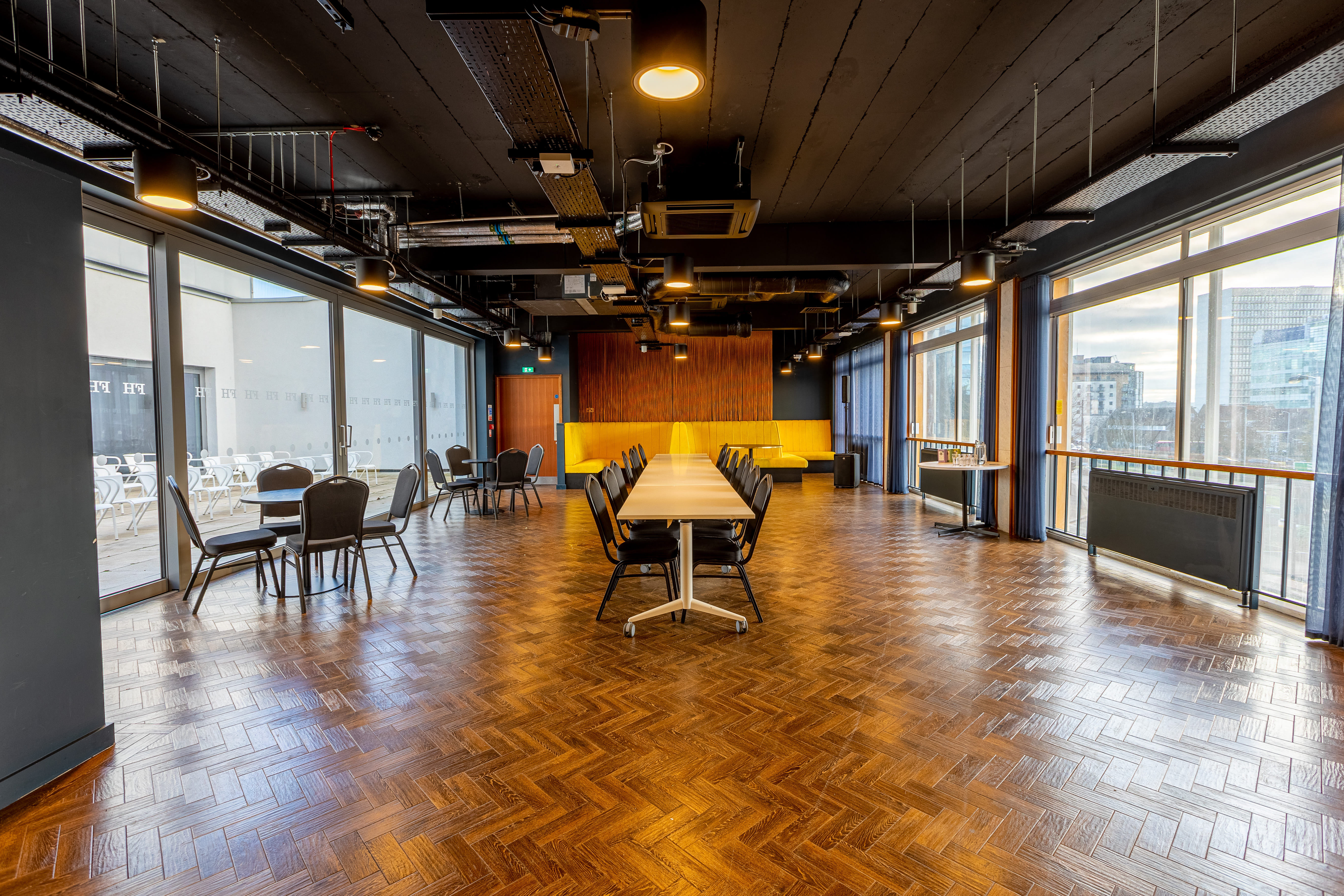 The Bistro is perfect for Private parties, staff training, courses and meetings, activity and exercise classes, and luncheons. The Bistro is a versatile room that is surrounded by great natural light from its bordering sides. You can create any seating arrangement in the Bistro for a variety of events and guest numbers. For businesses, this space is perfect for reviews, meetings, away days, or training. Our in-house Hospitality team means your bespoke catering requirements can be met, and our technical team can execute the setup and facilities you require.