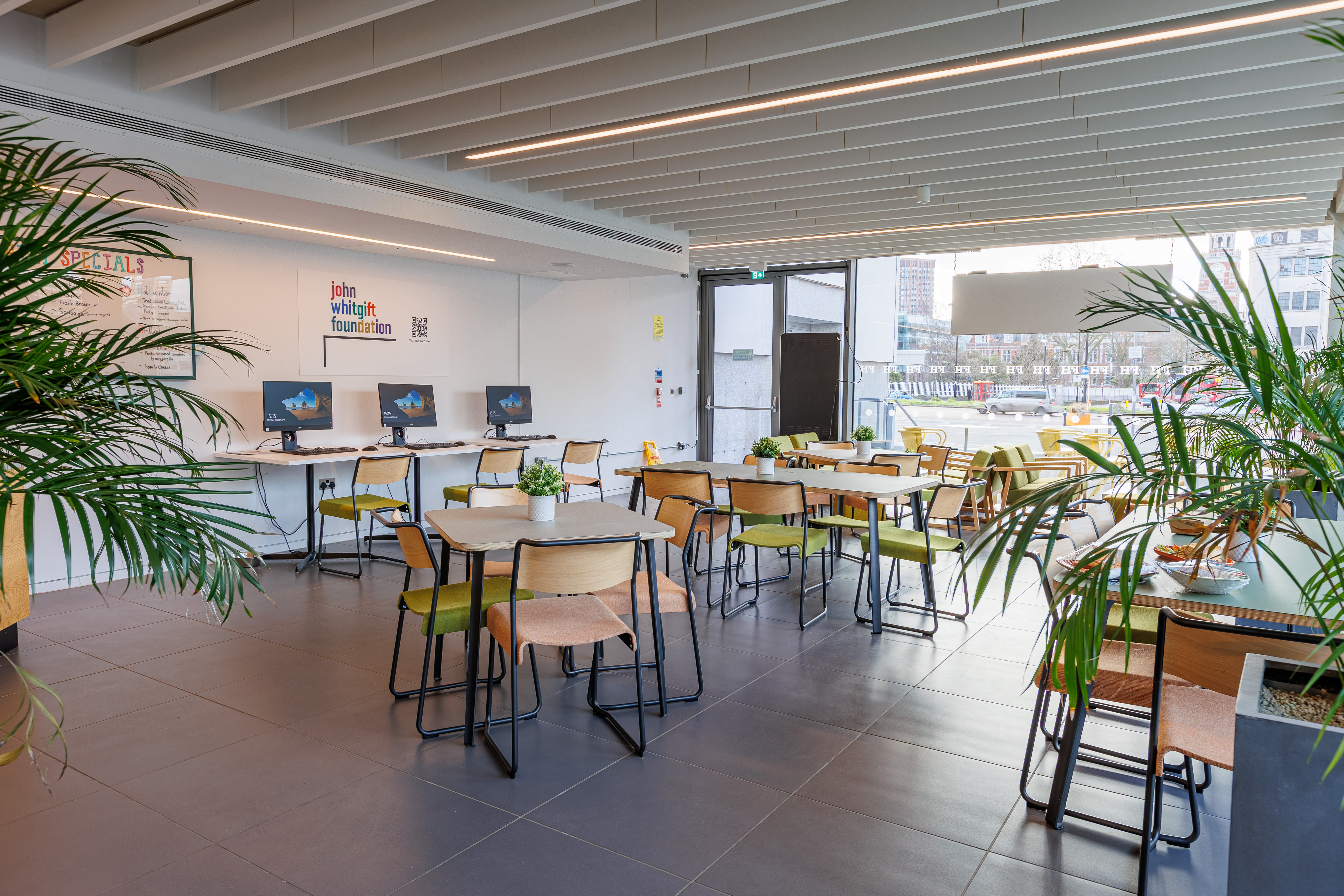 The John Whitgift Community Cube is a multi-functional and purpose space. The Cube is a self-contained café serving cakes, sandwiches, and hot meals during the day. Our distinctive coffee comes from 80 Stone coffee roasters who are based in Croydon, and we also stock a wide range of herbal teas and beverages. Our three computers have been provided by The John Whitgift Foundation and provide free internet access to the community. Our community cube hall adjoins to our café and is a perfect venue to host kids’ parties, a small conference or run a workshop. Why not come in for a home-grown coffee and a slice, whilst you view all The Cube has to offer. Capacity: 100 Perfect for: children’s birthday parties, breakfast, lunch, grabbing a coffee, meetings, work hub
