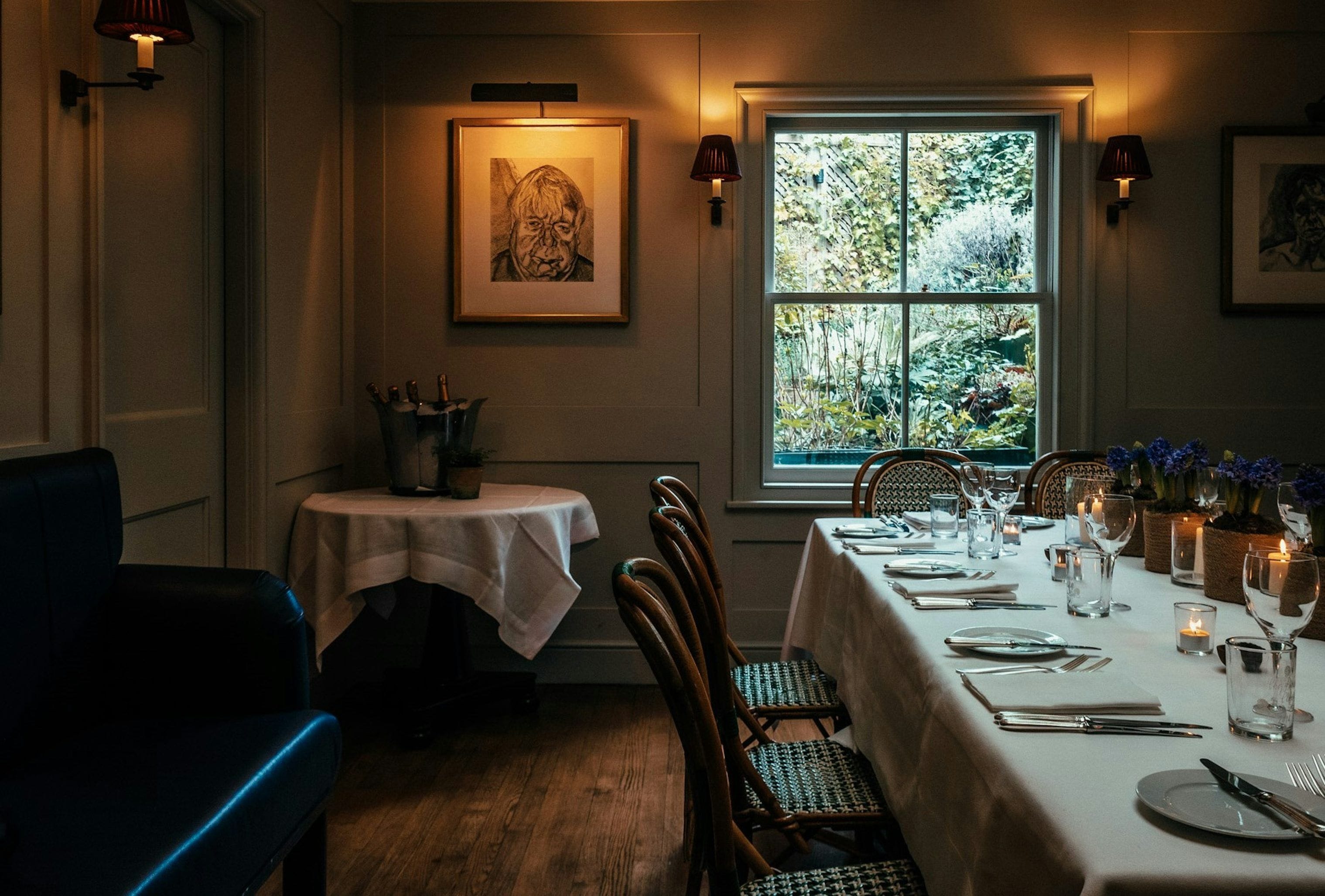 Designed specifically for private functions, this room is ideal for small intimate breakfasts, lunches or dinners, cocktail parties, meetings or small corporate events. The panelled room is painted throughout in our house colour powder blue, hung with Modern British works of art, furnished with antiques and decorated with seasonal floral displays. Discretely approached from the main bar, the Wine Room has its own private facilities and has the advantage of sliding doors which reveal (if desired), the working kitchen. We aim to provide a bespoke service and offer guidance, if required, with food and wine choices. CAPACITY Maximum seating: 26 guests (2 x 8 & 1 x 10 large circular tables, or up to 16 guests at 1 large oval table – (with a Set Menu or a pre ordered menu from a small selection.) Maximum capacity for cocktails/standing reception: 35-40 guests MENU Although our menus change daily, we are able to send suggested Sample Menus for the season, which reflect our style, and give an indication as to market availability of items. We normally offer a either a set menu or a limited choice for Private Parties which are designed to incorporate the host’s special requests or favourite dishes. If you would like to book our private dining room for 10 or fewer guests, we would be able to offer the a la carte menu on the day of your event. In all cases we offer alternative dishes to those guests who may have dietary restrictions. A list of seasonally-changing canapés for pre-dinner bites is also available, along with our world class Wine List and list of Cocktails.
