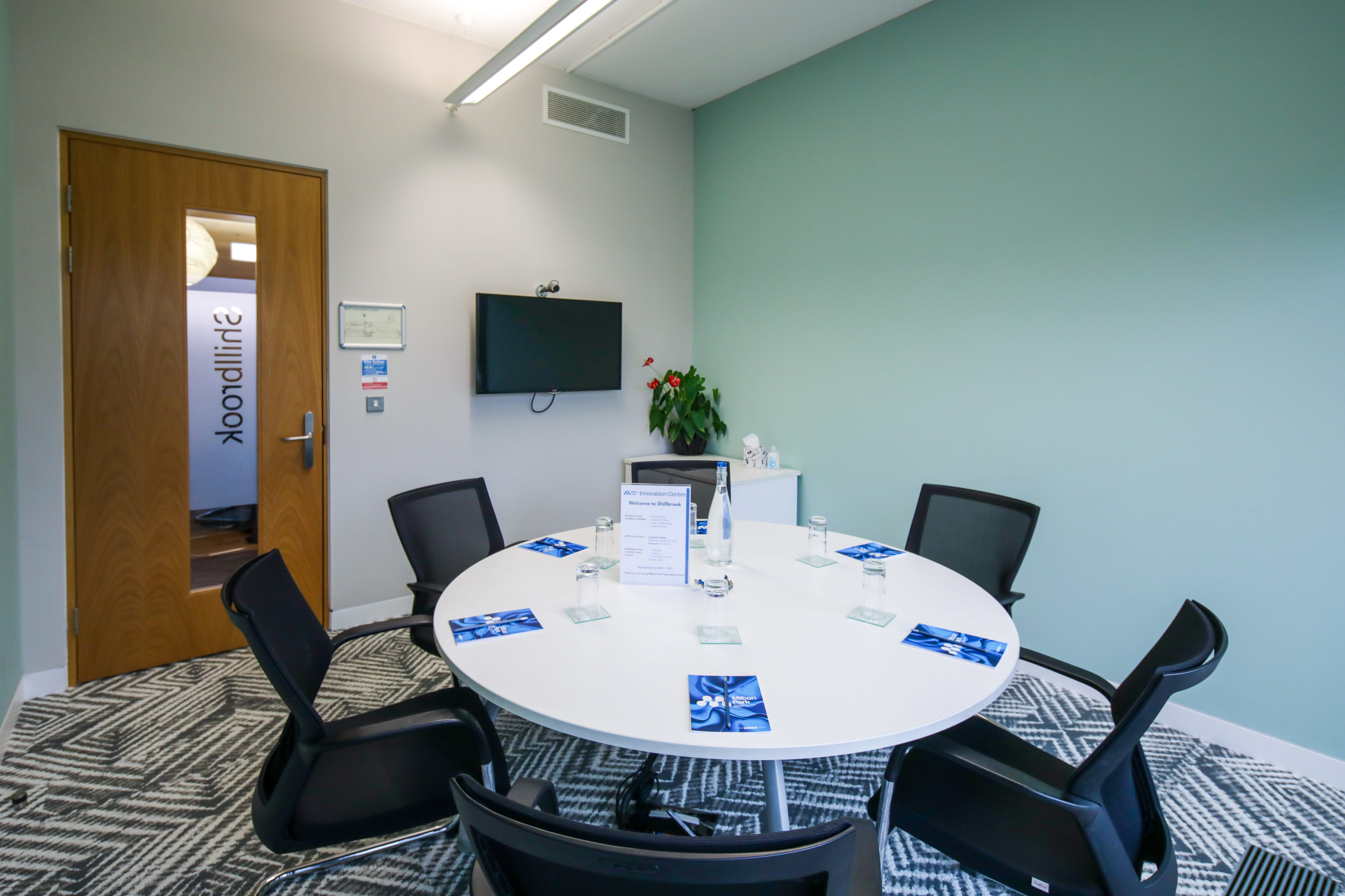 The Shillbrook meeting room has a fixed round table. It can seat up to 6 delegates. Facilities include: an audio visual screen that can be connected by VGA or HDMI (both cables supplied), superfast, fibre to the building Wi-Fi. This is a contended line but extremely reliable and will be fine for low usage Filtered water and glasses included and a flipchart, a whiteboard and pens. Catering can also be arranged in advance if required.