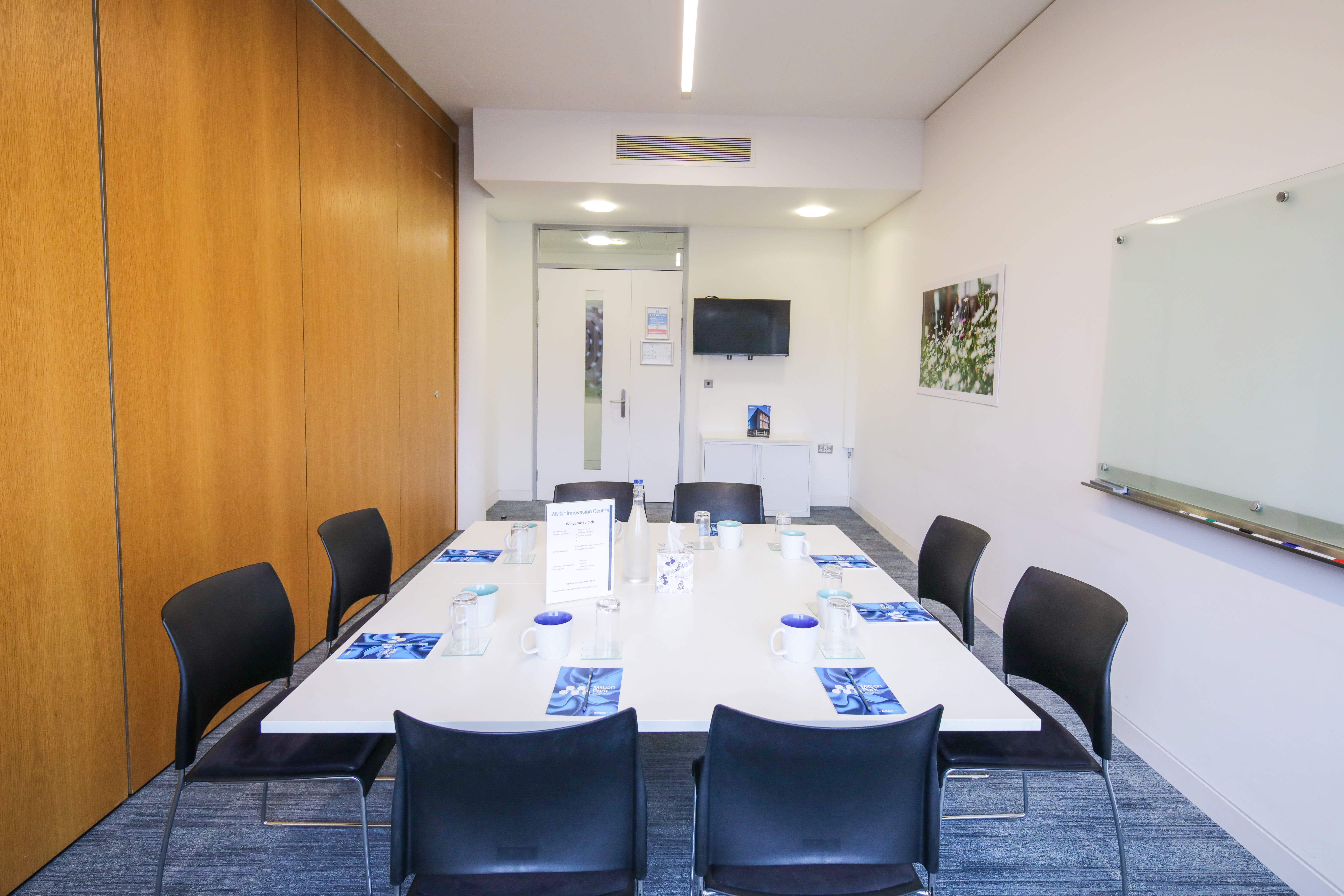 The Ock is a board-room style meeting room. It can seat up to 10 delegates. Facilities include: 42” Audio visual screen that can be connected by HDMI (cable supplied), superfast, fibre to the building broadband. Contended 20/4Mb LAN (local area network) connection which can be accessed wirelessly also. Filtered water and glasses included and a flipchart, a whiteboard and pens. Catering can also be arranged in advance if required.
