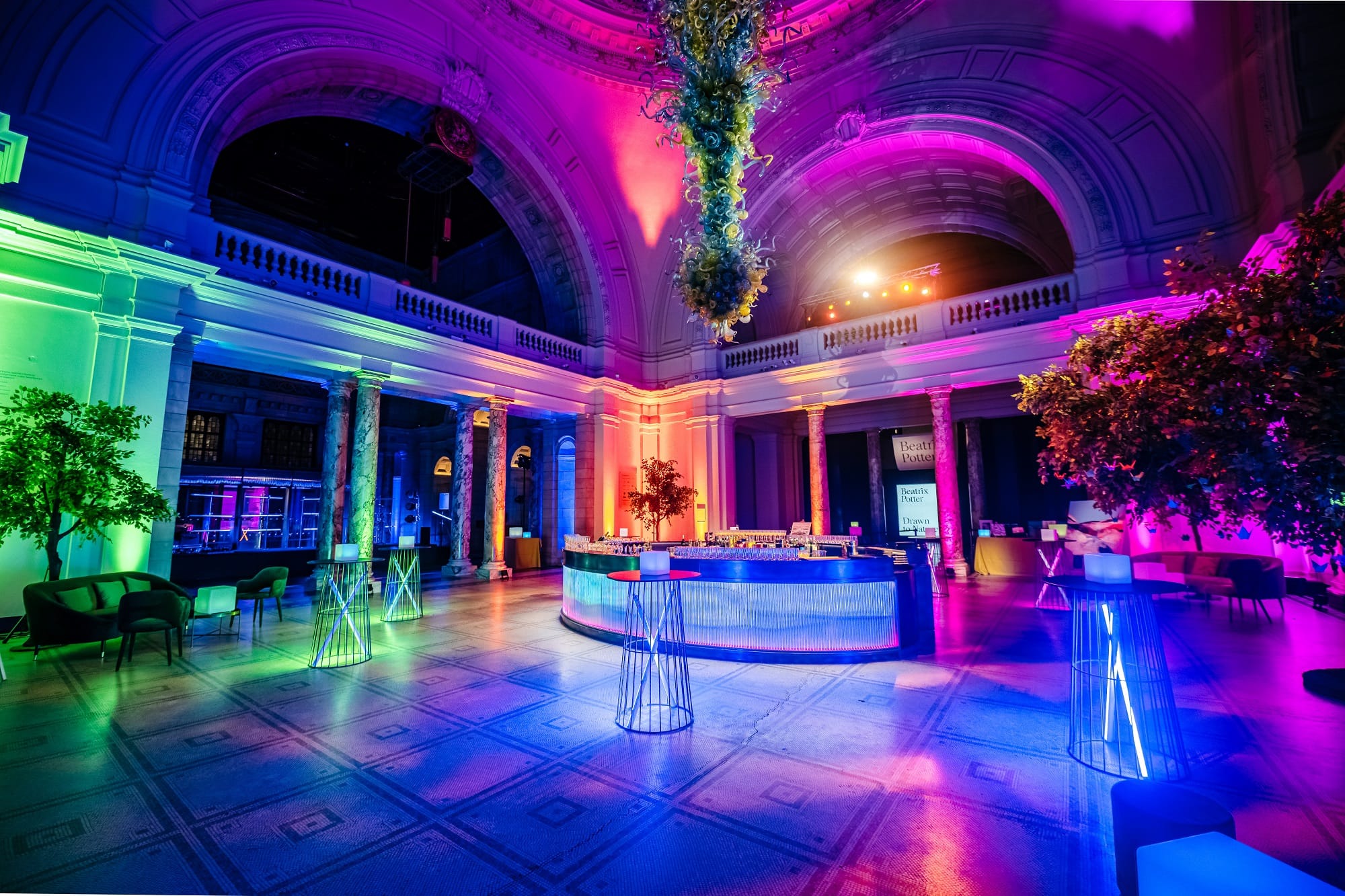 The Dome is a versatile and iconic V&A South Kensington space for a wide range of event formats. Guests can enjoy corporate and private events out of hours against a backdrop of its beautiful marble pillars, domed ceiling, central Art Deco bar, backdrop of Medieval Renaissance sculpture, and famed Dave Chihuly glass chandelier. This iconic V&A space is ideal for an after-party or late night event due to its capacity for a dancefloor and late licensing up to 2am, a rare feature for a London museum.