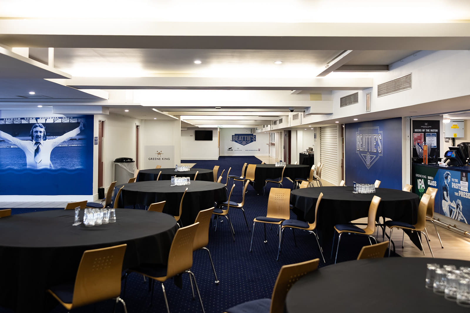 Beattie’s Suite is one of our largest function rooms and is situated on the 2nd floor in our South Stand. The room can comfortably accommodate up to 250 delegates for a conference or 220 guests for a dinner and dance. The suite is entirely self-sufficient, featuring its own bar, serveries, cloakroom, and restroom facilities. This Suite is fully accessible for those with accessibility needs.