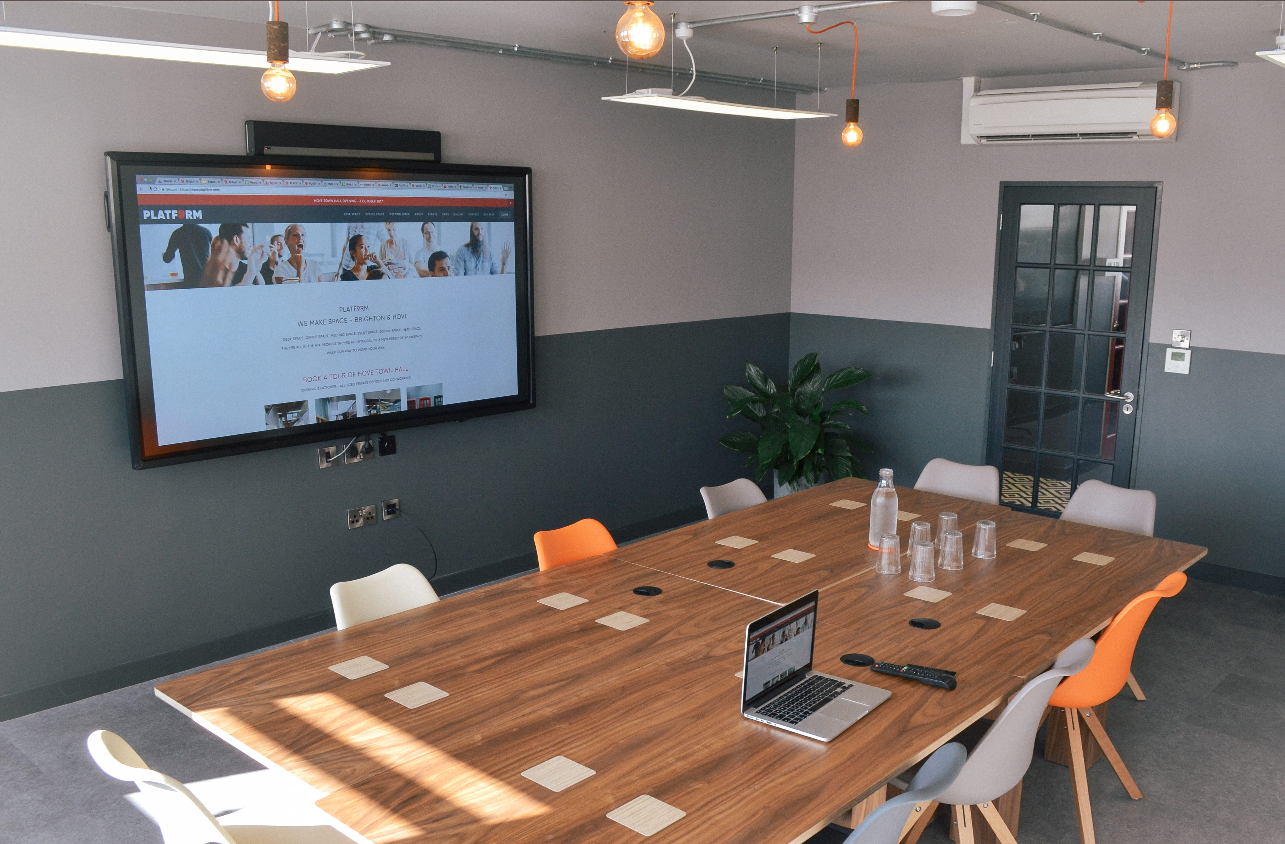 Our larger, off-site meeting space can be flipped around to create a theatre-style layout for presentations. Find your ideal private meeting room or conference venue in one of our smart, kitted-out spaces for get-togethers for two to twenty people. We have meeting rooms available in both our Brighton and Hove locations, complete with everything you might need for a team away day, strategy sessions or intimate event. 86" Interactive TV Accessible Apple TV and HDMI connection Bespoke furniture Full Catering (Extra) Super-fast WIFI Tea & Coffee (Extra) Whiteboard wall