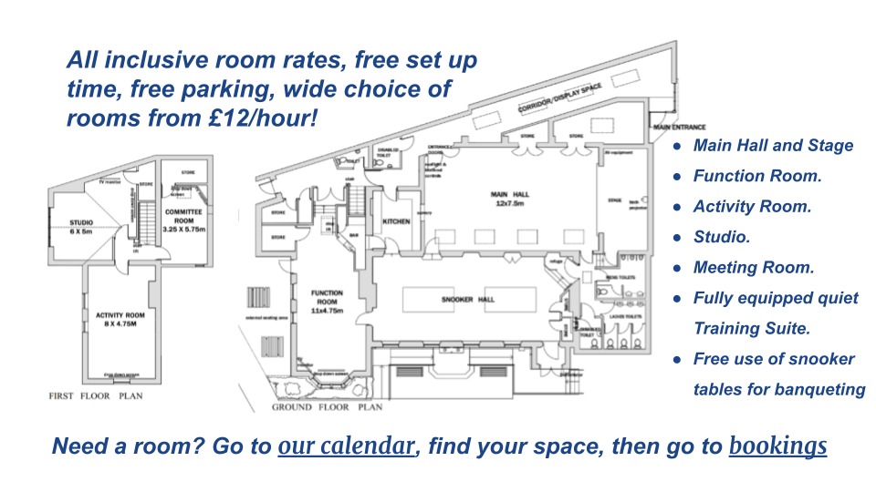 We are a charity run by local volunteers. We are fully licenced and have 5 well equipped Rooms to choose from at highly competetive rates. We have ample free parking and very close train and bus links between Leeds, Harrogate and York. We are fully compliant with disabled access requirements and our Main Hall has top quality A/V stage and screen equipment.