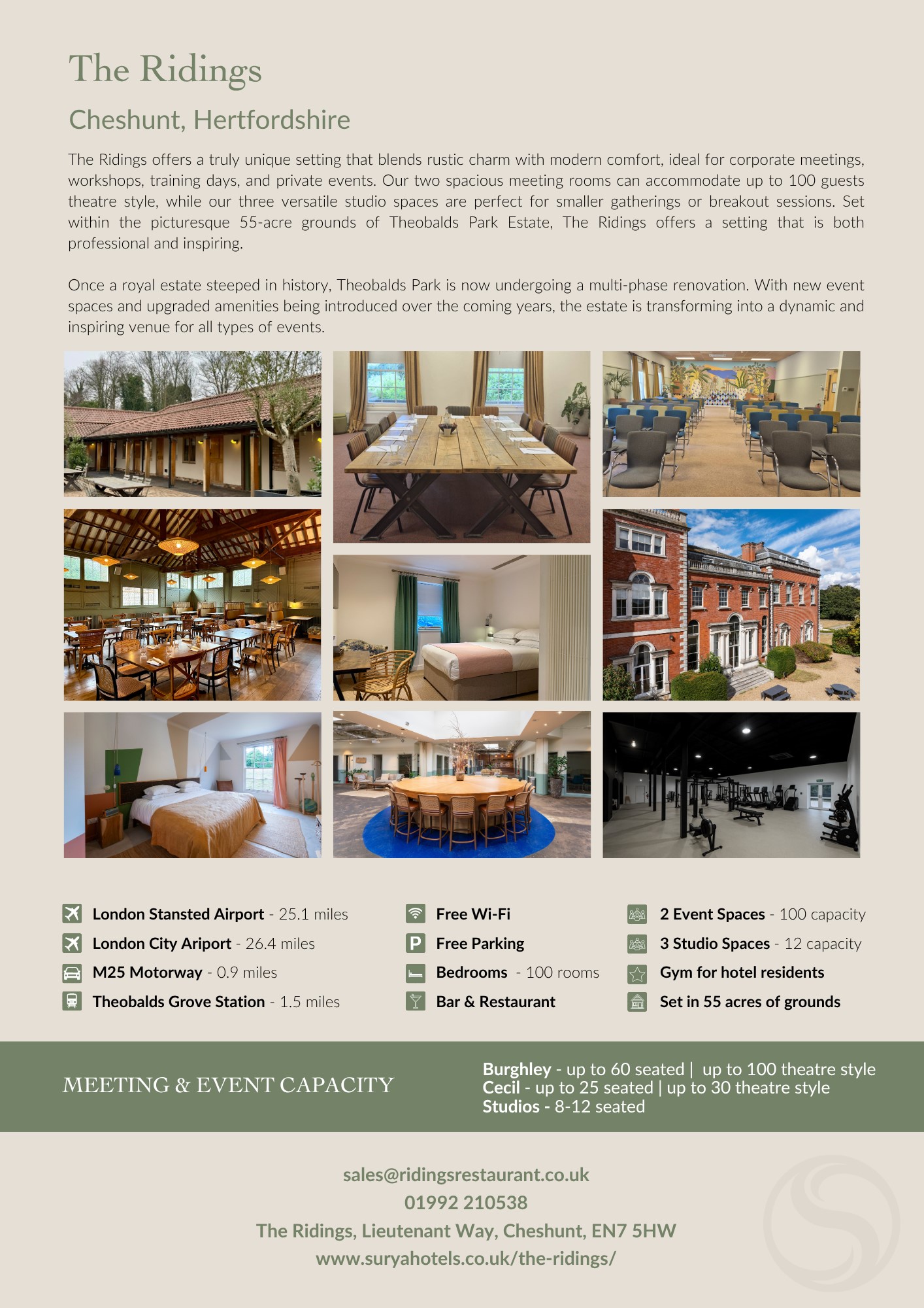The Ridings - part of Theobalds Estate is steeped in history and set in 55 acres of beautiful woodlands and gardens, The Ridings offers a unique and inspiring backdrop for events, overnight stays, and hospitality experiences. Once linked to King James I the estate blends rich heritage with modern comfort and versatility. Part of the wider Theobalds estate—currently undergoing an exciting transformation —The Ridings is fully operational and ideal for both corporate and private bookings. We offer: 75 well-appointed bedrooms, perfect for overnight guests. A range of flexible event spaces, including two main meeting rooms and a breakout room The Ridings Restaurant, serving fresh, seasonal cuisine Access to our onsite gym, with a wellness and spin studio available for private hire A setting ideal for indoor and outdoor events, with team-building opportunities across the 55 acre estate.