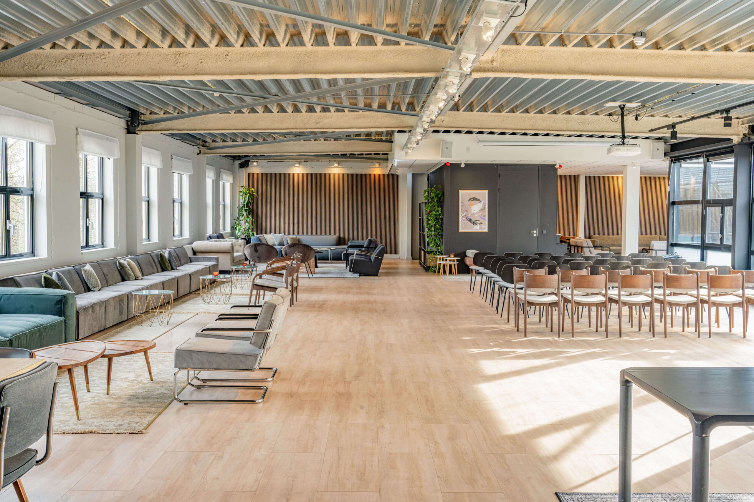 The Space is a bright, spacious room with a unique design, industrial-style ceilings, and plenty of natural daylight. Featuring comfortable lounge areas and a large central meeting table, the room is ready to host a wide range of formats in a welcoming, open setting. The Space comes equipped with a basic AV setup, including a projector, screen, and sound system. It's perfect for interactive sessions, allowing you to break the group out into different corners and lounge areas within the same room, ideal for dynamic workshops or brainstorms. The layout is highly flexible: you can grow up to 150 guests in theatre style, 100 guests in small group settings, 72 guests in classroom style and 45 guests in boardroom or U-shape setups. You can rent The Space as a standalone venue or combine it with the other rooms on the first floor – The Apartment, The Suite, and The Lodge to create a fully tailored breakout experience for your event.