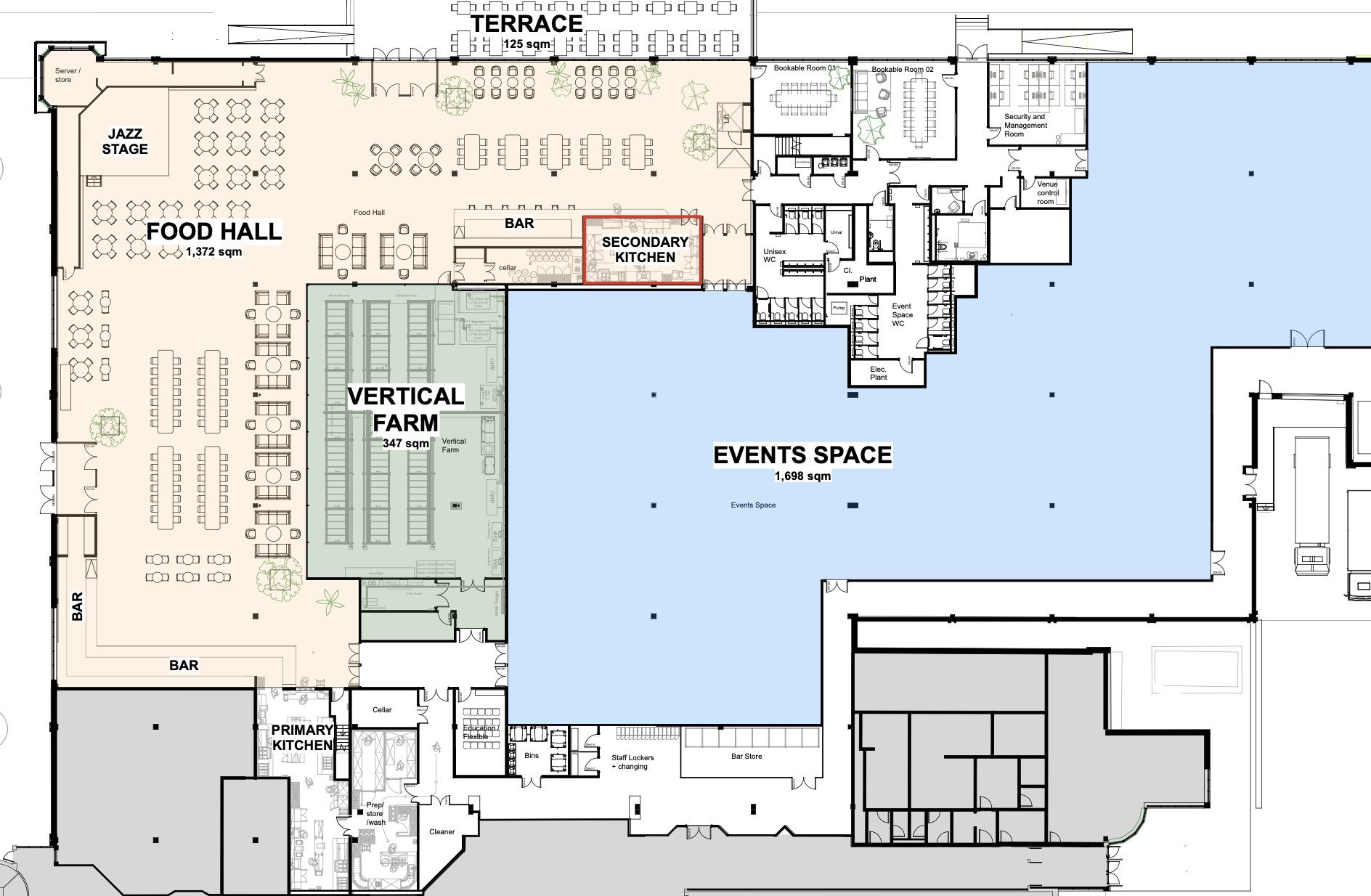 A full takeover of Corner Corner gives you exclusive access to our entire venue of 1,698 sqm of open-plan space in the heart of Canada Water. Whether you’re planning a festival-style celebration, multi-activation brand launch, or large scale corporate event, our venue adapts to whatever your needs are. With direct access to our Food Hall, cafe, terrace and on-site vertical farm, the possibilities are endless. The Food Hall is the heart of Corner Corner. It is the interconnecting space to the food traders, Plant Room and the stage. The space features a large bar, food outlets, communal seating and full technical integrations, offering unlimited possibilities for events. The lighting, sound and configuration can be utilised to transform the space, from private smaller parties to exclusive hire. The Food Hall can host up to 600 people for receptions, award dinners, brand activations and conferences.