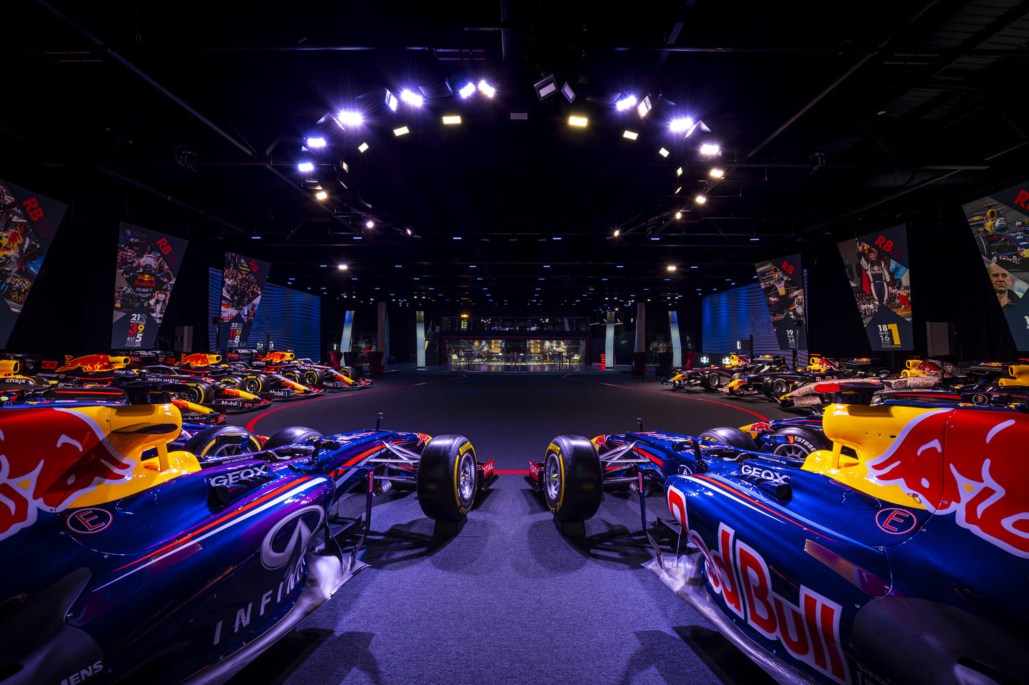 Upon entering MK-7, visitors are immediately immersed in the defining moments that have shaped Oracle Red Bull Racing's legacy. The space showcases our complete racing fleet, featuring every championship car from the inaugural RB1 through to the dominant RB19 – with the RB7 notably absent as it's out on the road as our running showcar. MK-7 combines functionality with inspiration through its flexible design. The facility includes a main boardroom alongside two intimate meeting spaces, all overlooked by a spectacular mezzanine level that provides amazing views of our automotive heritage below. This unique environment creates an energising atmosphere that transforms any gathering into an extraordinary experience, whether hosting corporate meetings, special events, or exclusive presentations.