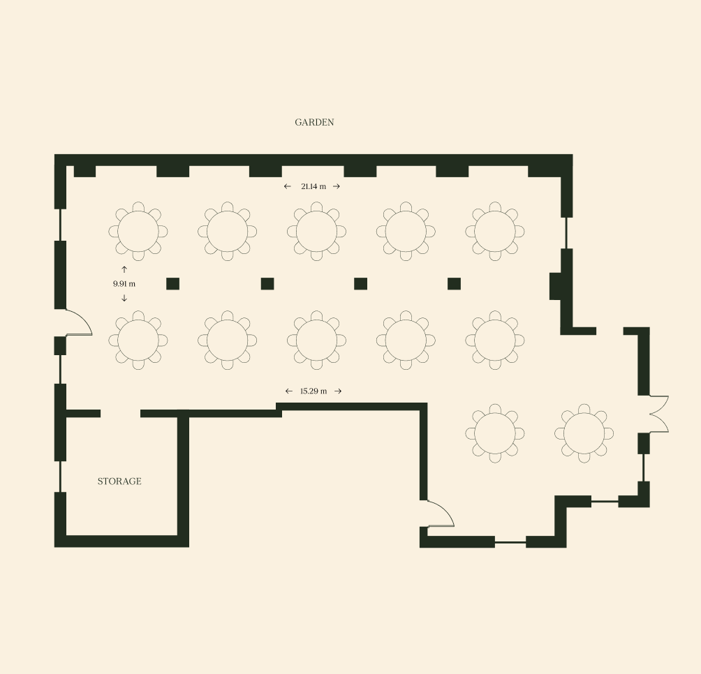 Our event space sits in the basement of the old farmhouse, with five glass arches opening onto a terraced garden with firepit and outdoor seating — seamlessly blending inside and out. It’s warm, versatile, and full of natural light, shifting effortlessly from season to season, day to night. Hire includes exclusive use of the 260 square metre event space, terrace and walled garden as well as onsite parking. The Shire spans 150 acres of lakes and parkland, with optional add-ons including a wild swimming lake, sauna, cold plunge, tennis court, marquee field and a boardroom for up to 20 guests — perfect for offsites, special celebrations or events designed to leave a lasting impression.