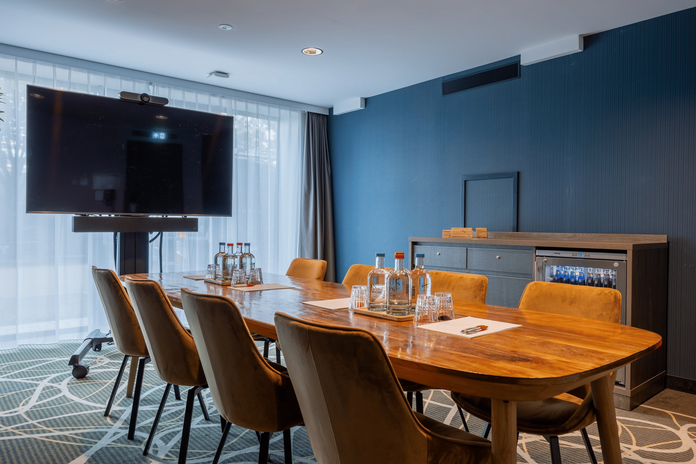 The Herengracht meeting room, located on the ground floor, is the perfect space for small-scale business gatherings that require focus, comfort, and a professional atmosphere. Designed to host up to 20 guests, the room has a total area of approximately 26 m² and is ideally suited for board meetings, brainstorming sessions, private presentations, and executive discussions.