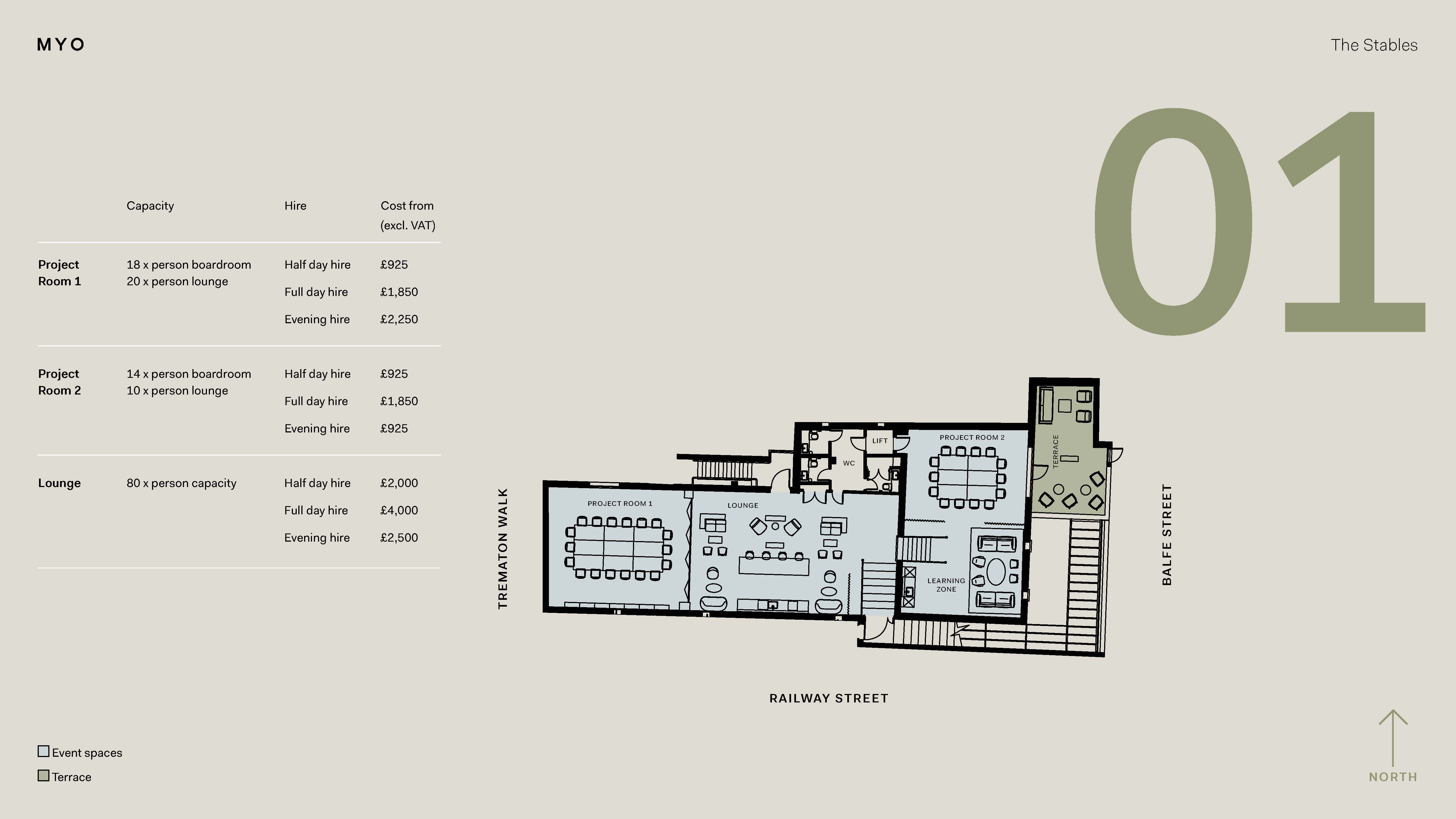 Our second project room sits on the first floor of this Grade II listed heritage building. Come up the stairs and you are welcomed straight into the learning zone with soft furnishings and breakout furniture . To your left the 14 person boardroom provides the ideal environment to strategise with colleagues. If you want a moments fresh air, step out onto the private terrace.