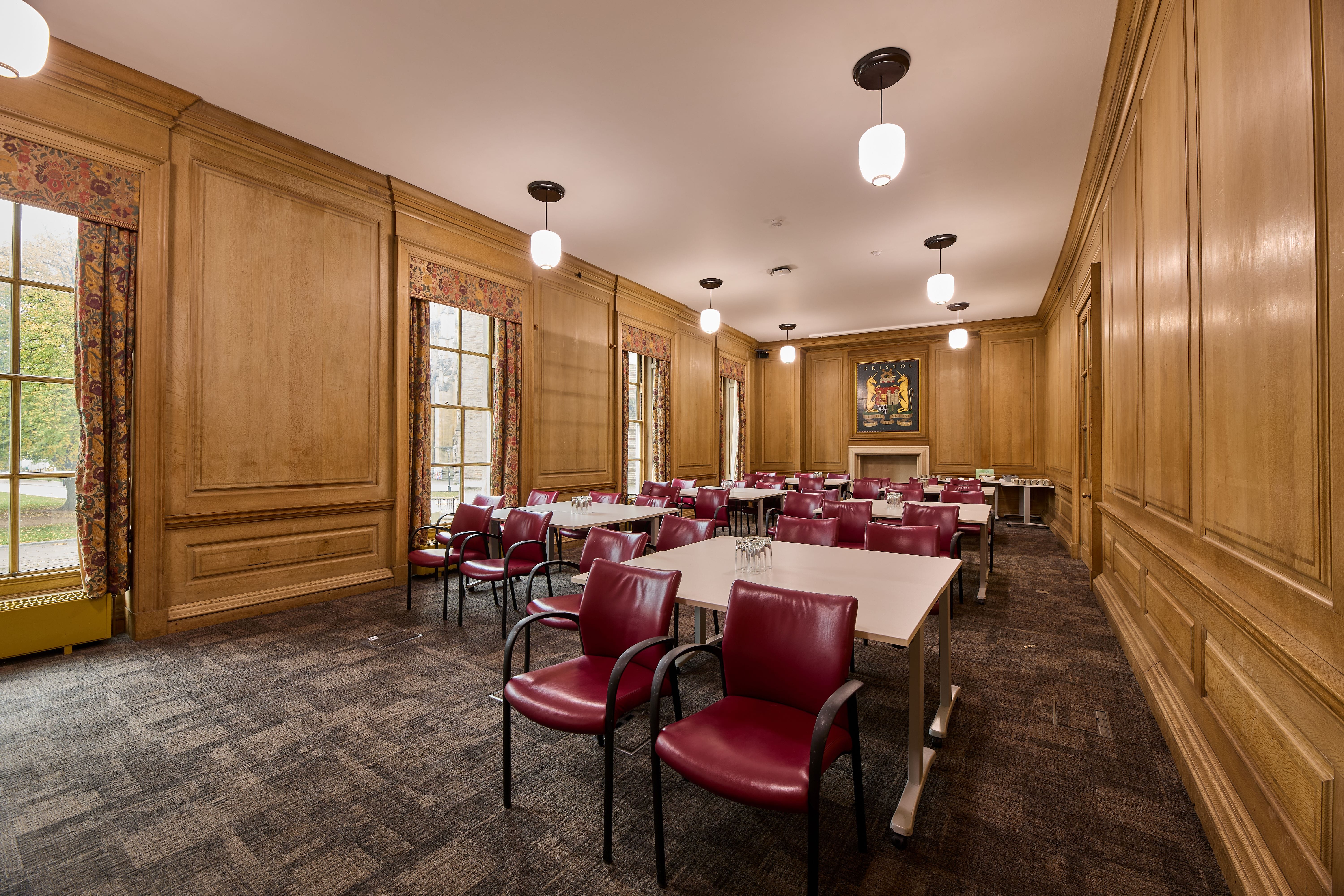 This grand heritage room, steeped in history, boasts rich wood paneling from floor to ceiling, framing views across Bristol's iconic College Green and Bristol Cathedral, creating an inspiring backdrop for any event; featuring an , ornate fireplace with a prominent coat of arms, a flexible layout for various setups, and integrated multimedia facilities including a projector for seamless presentations, and hybrid technology.