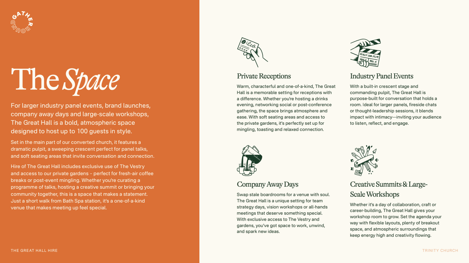 For larger industry panel events, brand launches, company away days and large-scale workshops, The Great Hall is a bold, atmospheric space designed to host up to 100 guests in style. Set in the main part of our converted church, it features a dramatic pulpit, a sweeping crescent perfect for panel talks, and soft seating areas that invite conversation and connection. Hire of The Great Hall includes exclusive use of The Vestry and access to our private gardens – perfect for fresh-air coffee breaks or post-event mingling. Whether you're curating a programme of talks, hosting a creative summit or bringing your community together, this is a space that makes a statement. Just a short walk from Bath Spa station, it’s a one-of-a-kind venue that makes meeting up feel special.