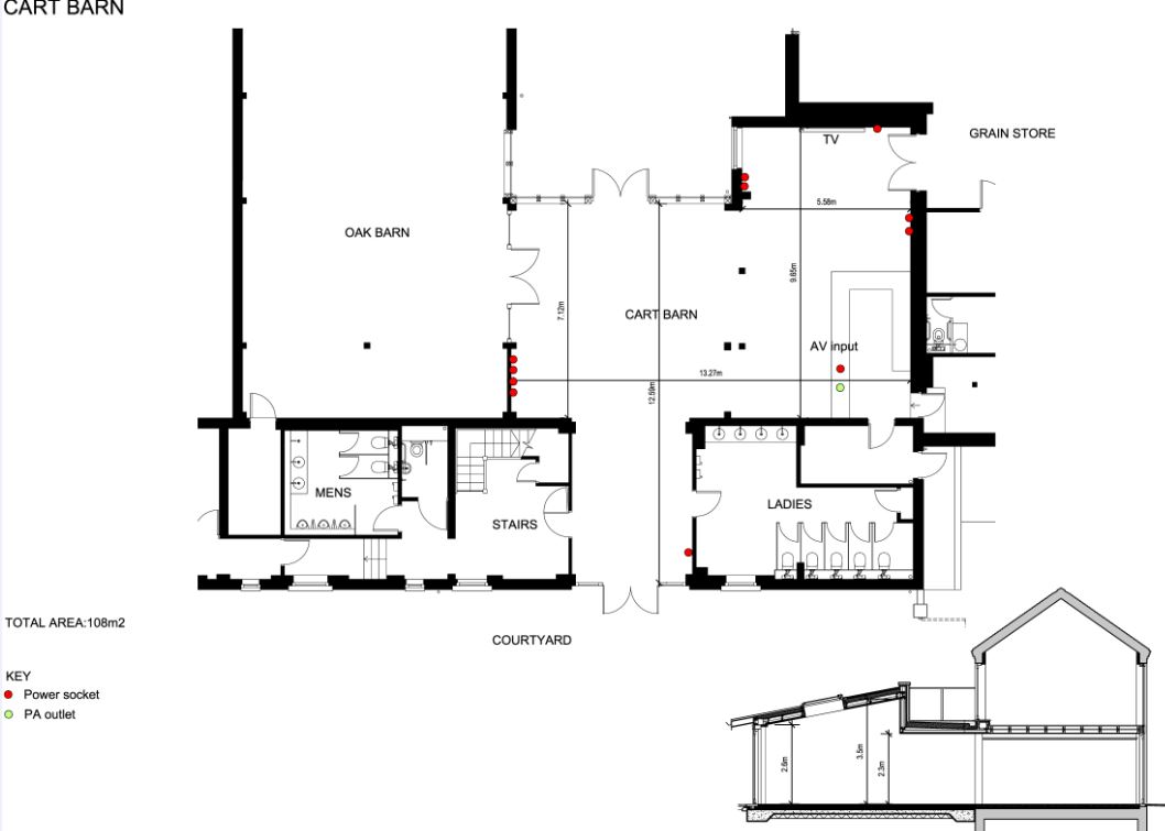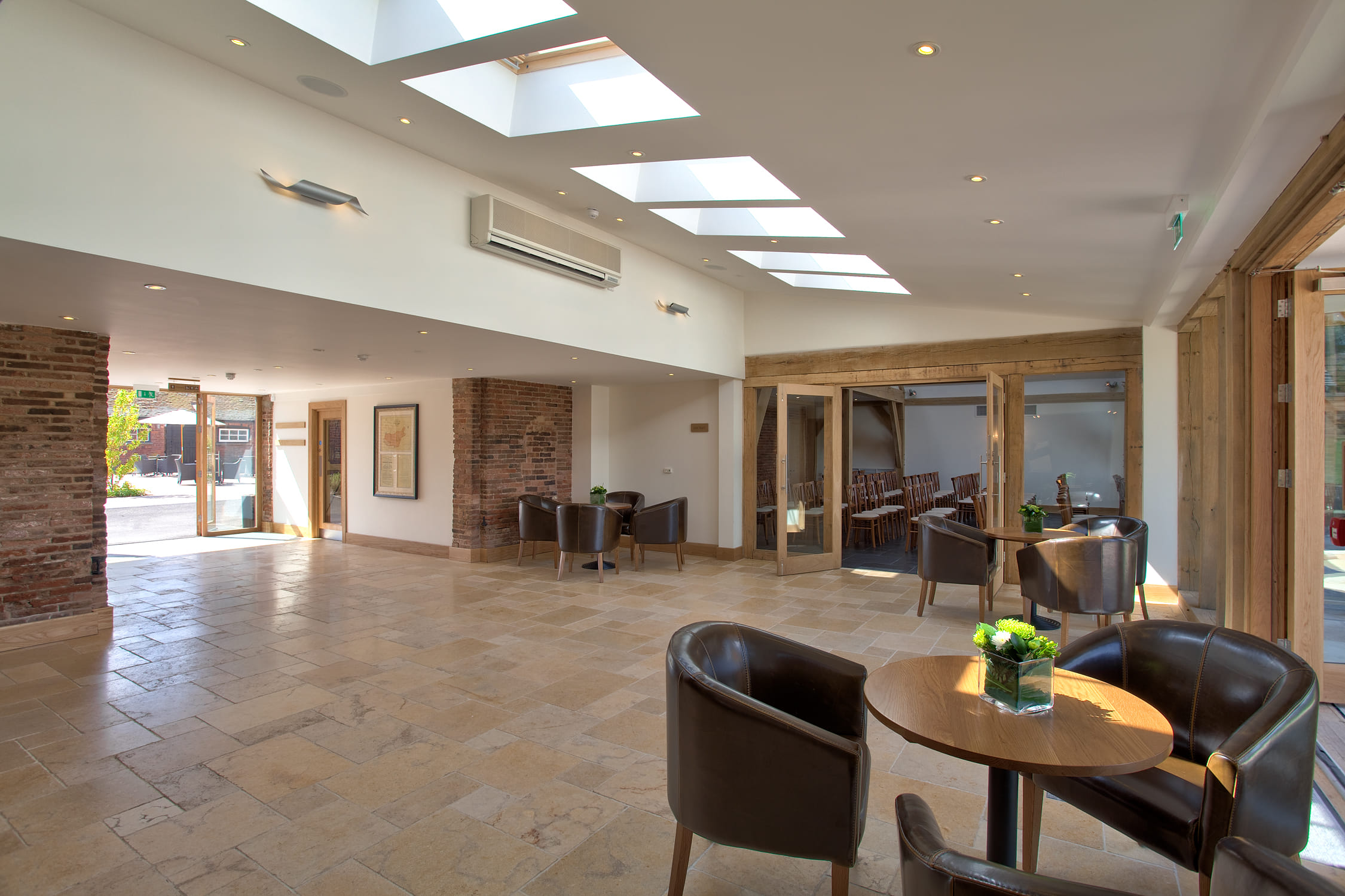 SPACIOUS, LIGHT-FILLED RECEPTION SPACE AT MYTHE BARN The Cart Barn in an ‘L’ shaped area and boasts oak roof trusses, bare brick to some walls, roof lights and beautiful beige limestone to the floor. This is the central area within the barn that connects to all of the other spaces throughout. It hosts the bar and is ideal for informal gatherings, receptions and refreshment breaks. Some of the key features include: Limestone floor Natural light Air conditioning Wheelchair accessible Double doors directly into the courtyard Adjustable lighting levels Bar