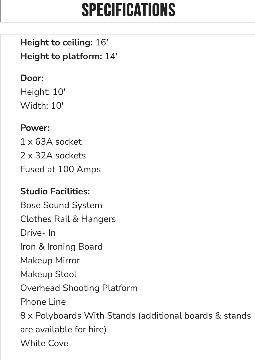 Studio 5 White Cube has an overhead shooting platform which is perfect for shooting directly down onto the subject. This studio is ideal for small to medium set builds and able to cater for drive ins. There is no separate hair and make up area in this studio. We are more than happy to meet all lighting, equipment and catering needs on request.