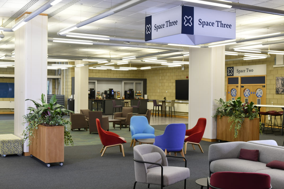 Space 3 is a dynamic and newly enhanced area designed for exhibitions, networking, and breakout activity. We’ve opened up the downstairs space by removing the glass screen, creating a more versatile, open environment ideal for delegates to flow between sessions. To improve comfort, the hard tiled flooring has been replaced with carpet tiles, giving the space a warmer and more welcoming feel. The room features two moveable registration desks, six stylish fixed booths (which can be removed and rebuilt with prior agreement), and an updated mix of soft seating and workstation tables—all fully moveable so you can create the perfect layout for your event. Two coffee stations and background music help set the right atmosphere for networking and exhibition activity. For digital content and presentations, Space 3 offers a wall‑mounted flat‑screen TV that can be linked to Space 1, a 98‑inch screen, and a portrait pillar‑mounted display that supports two additional content sources to complement the main presentation setup. Ideal for exhibitions, breakout areas, and shelf‑scheme expos, Space 3 combines flexibility, comfort, and high‑quality AV to support a wide range of event formats.
