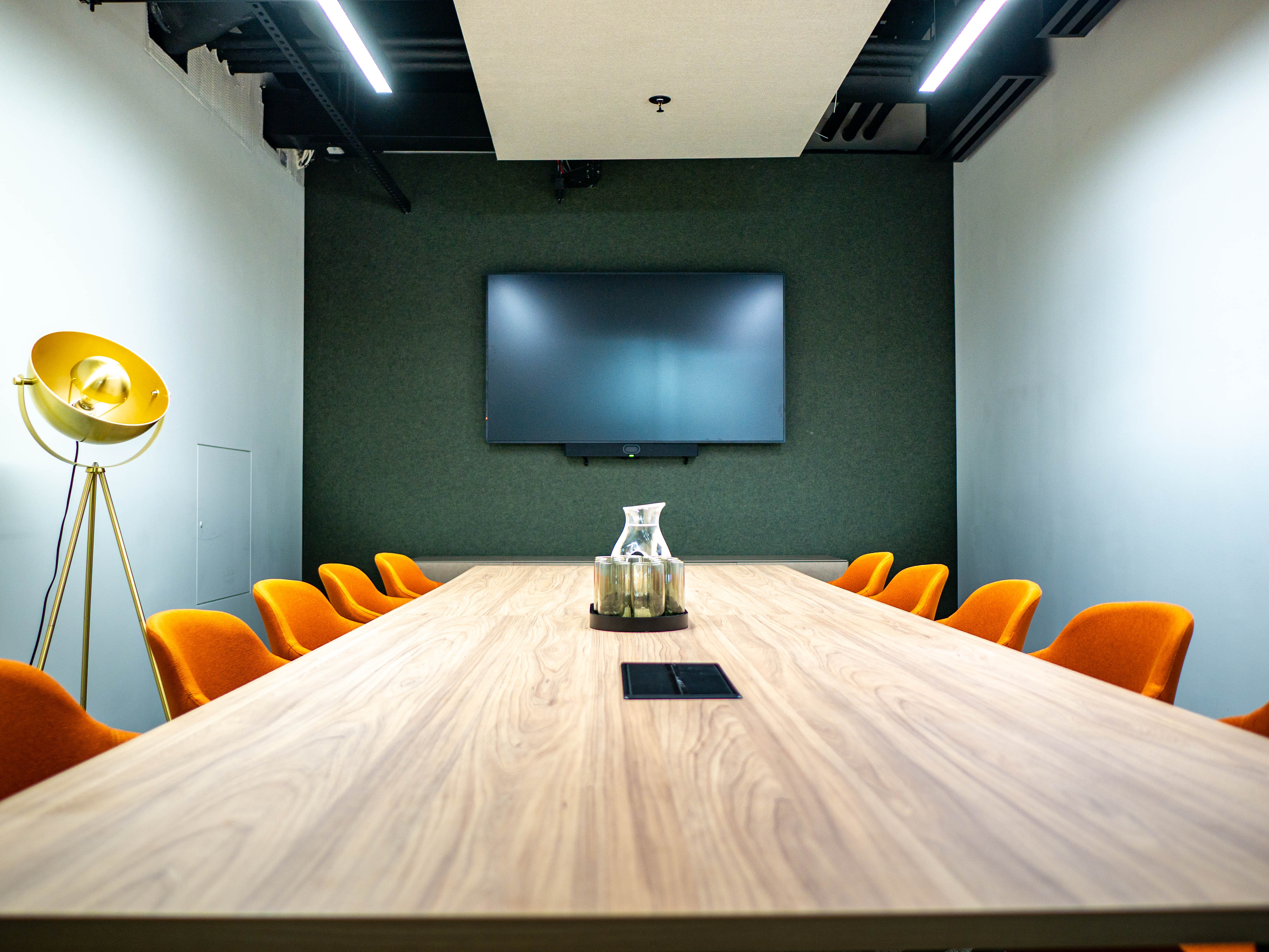 A spacious, design-led meeting room tailored for client presentations and collaborative strategy sessions. Equipped with a 65-inch commercial display, integrated video conferencing, and premium acoustic treatment, it delivers exceptional clarity for every discussion. Thoughtfully designed for comfort and performance, the space supports focused dialogue and confident, high-impact communication.