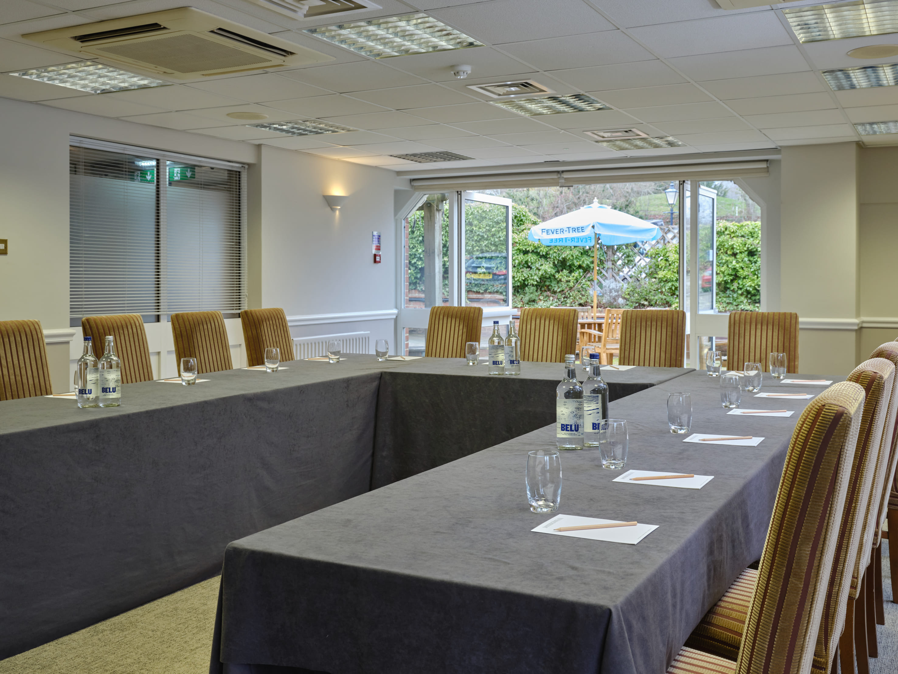 This inviting room is situated on the lower ground floor of the hotel, offering the unique advantage of direct access to a charming exterior patio area—perfect for a breath of fresh air or a relaxed outdoor break. Additionally, for your convenience, there is a fully equipped conference kitchen located on the same level, making it easy to prepare refreshments or meals during your stay. The room is bathed in abundant natural light, creating a bright and welcoming atmosphere. For added comfort, it features adjustable lighting to suit your needs, as well as individually controlled air conditioning to ensure the perfect temperature at all times.