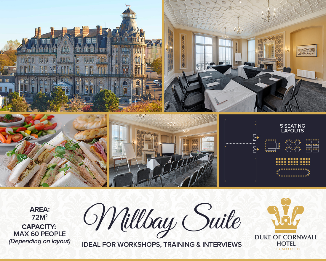 **Hire the Millbay Suite at The Duke of Cornwall Hotel for one of the best options for venue hire in a state of the art Plymouth hotel.** With the option to be configured as two separate meeting rooms or as one single space the Millbay Suite offers excellent versability. The separation of the two rooms makes the suite a great choice for workshops, interviews and training events.