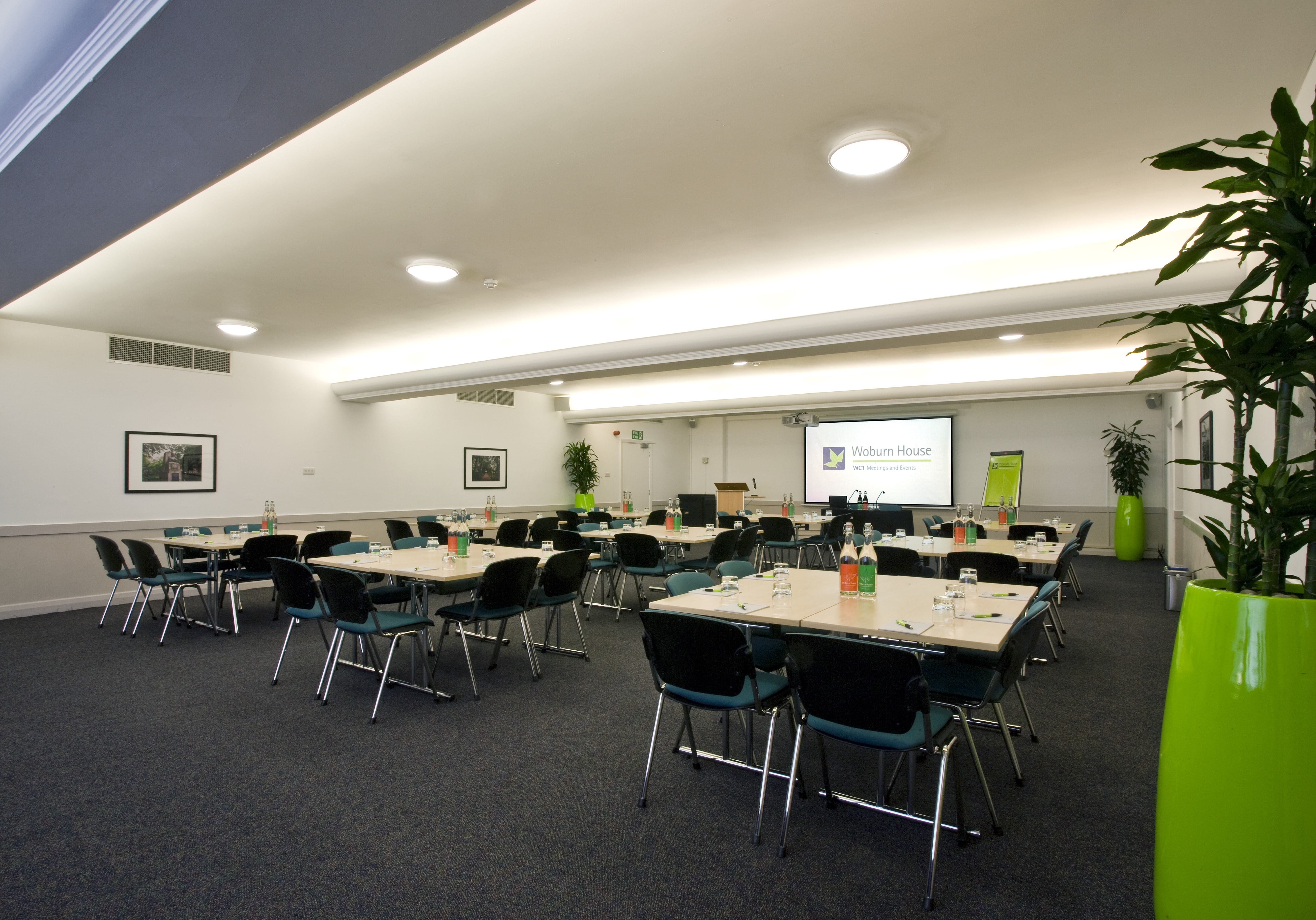 The Tavistock Room at Woburn House is perfect Space for conference venue hire and presentations for up to 120 people. Alternatively, it serves as a fantastic Space for networking refreshments and exhibitions or pre-dinner drinks for events taking place in the Woburn Hall. Located just a single flight of stairs from the Woburn Hall, the room is flexible and suitable for setting up in a variety of styles including theatre, cabaret and boardroom layouts. The room comes with a glass whiteboard and flipchart included with the option of hiring a PA system with microphones, HD LCD projector and laptop for those all important presentations. If you have people that would like to join your meeting or conference remotely we can install a video conference system allowing everyone in your meeting to be seen and heard by anyone joining the room remotely. Our equipment is compatible with all major video conference and meetings platforms such as Zoom or Microsoft Teams. Catering can be provided at the back of the room which is 16.5 x 9 (LxW) in size.