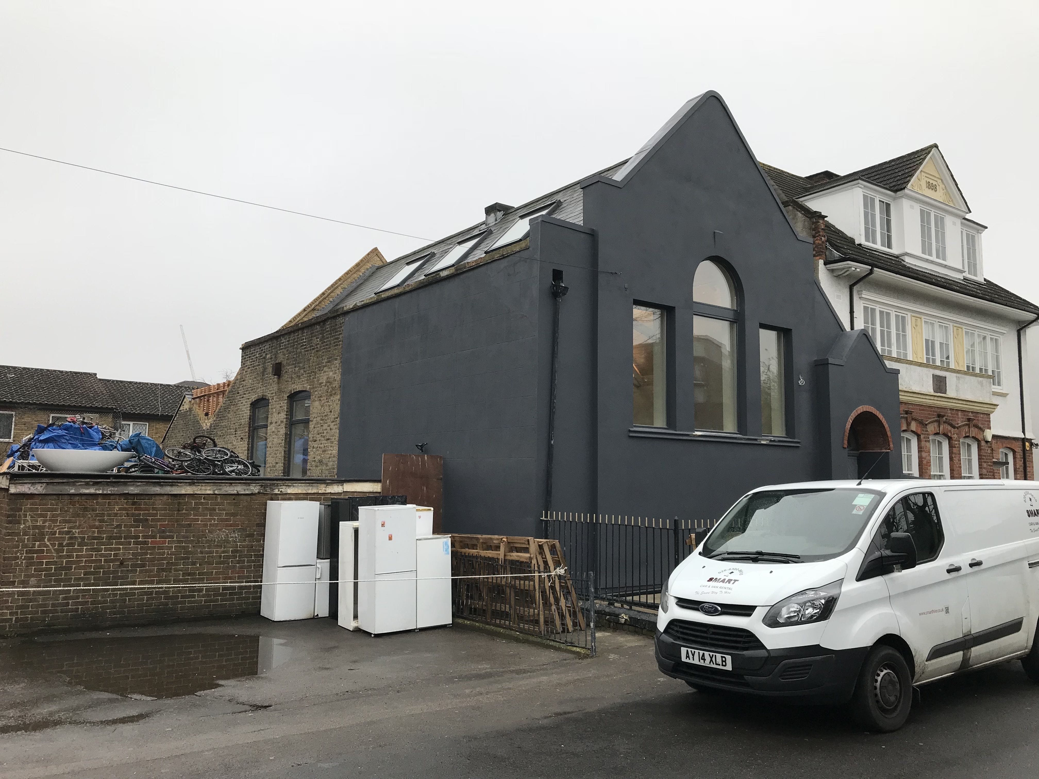 **Hire the Utopia House for your next event with a difference!** Built-in 1905 as a mission, the property benefited from a recent renovation. Keeping the originally pitched ceiling with 4 cross beams in the main room, the floor is mostly polished concrete with a natural sheen. The house is an open plan living room with granite kitchen tops and dark navy cupboards and gold distressed splashback. Above the kitchen sits a mezzanine with 4 meters long desk overlooking the main space. From that level, one can get out to the roof terrace over the extension behind the main building. There are 3 bedrooms and 2 bathrooms. All rooms benefit from plenty of natural light. They are 6 large skylights in the main room and 10 side windows. The Walls are painted with high-quality paint in pale beige. The artwork is hanged from the ceiling level on the metal strings and can be removed upon request. The house is finished to the highest standard using finest minimalist materials. The house is positioned away from the main road on in the quiet residential area. On the outside, the house is pained dark navy colour