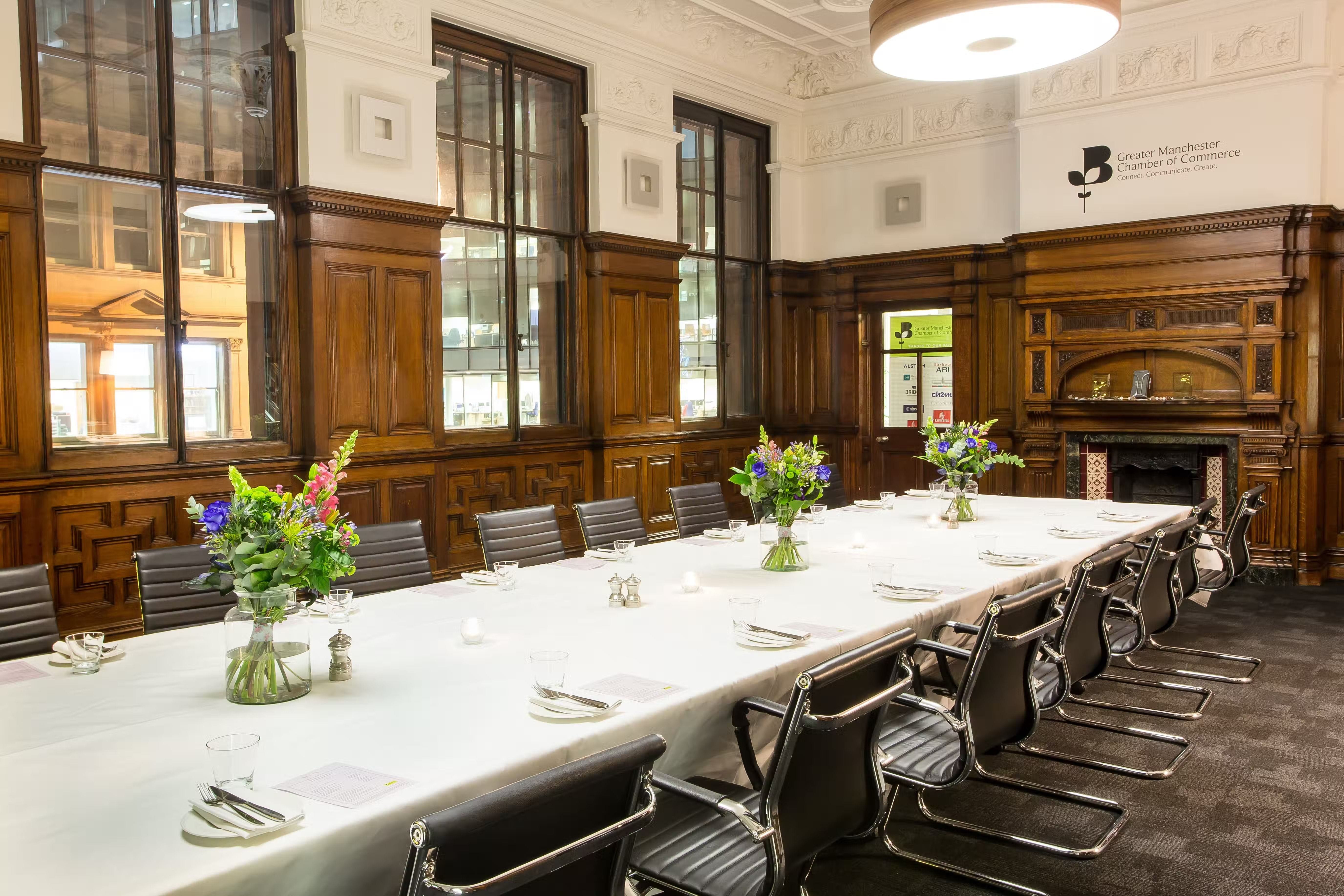 **Hire the Boardroom at Chamber Space for your next team meeting.** Chamber Space is one of Manchester's hidden gems, a unique meetings and events venue located on Deansgate in the heart of the City's thriving business and shopping district. Chamber Space is ideally located for any business looking to host a meeting or event in Central Manchester. This flexible events venue can cater for board meetings, seminars, private dinners, mediation sessions, drinks receptions and training events. The venue can cater for an intimate meeting between two people, right up to a drinks reception for 150. As well as this they offer excellent customer service at competitive prices. Situated within the majestic surroundings of Elliot House, Chamber Space offers something special that cannot be found in generic hotels and purpose built conference centres. Whether it’s a training day, drinks reception, product launch or just a simple team meeting room hire that needs to be out of the office; their helpful and professional team will make sure that you and your company are extremely well looked after. Part of the Greater Manchester Chamber of Commerce, the venue has become the go to destination for companies looking for stylish rooms at competitive prices in Central Manchester.