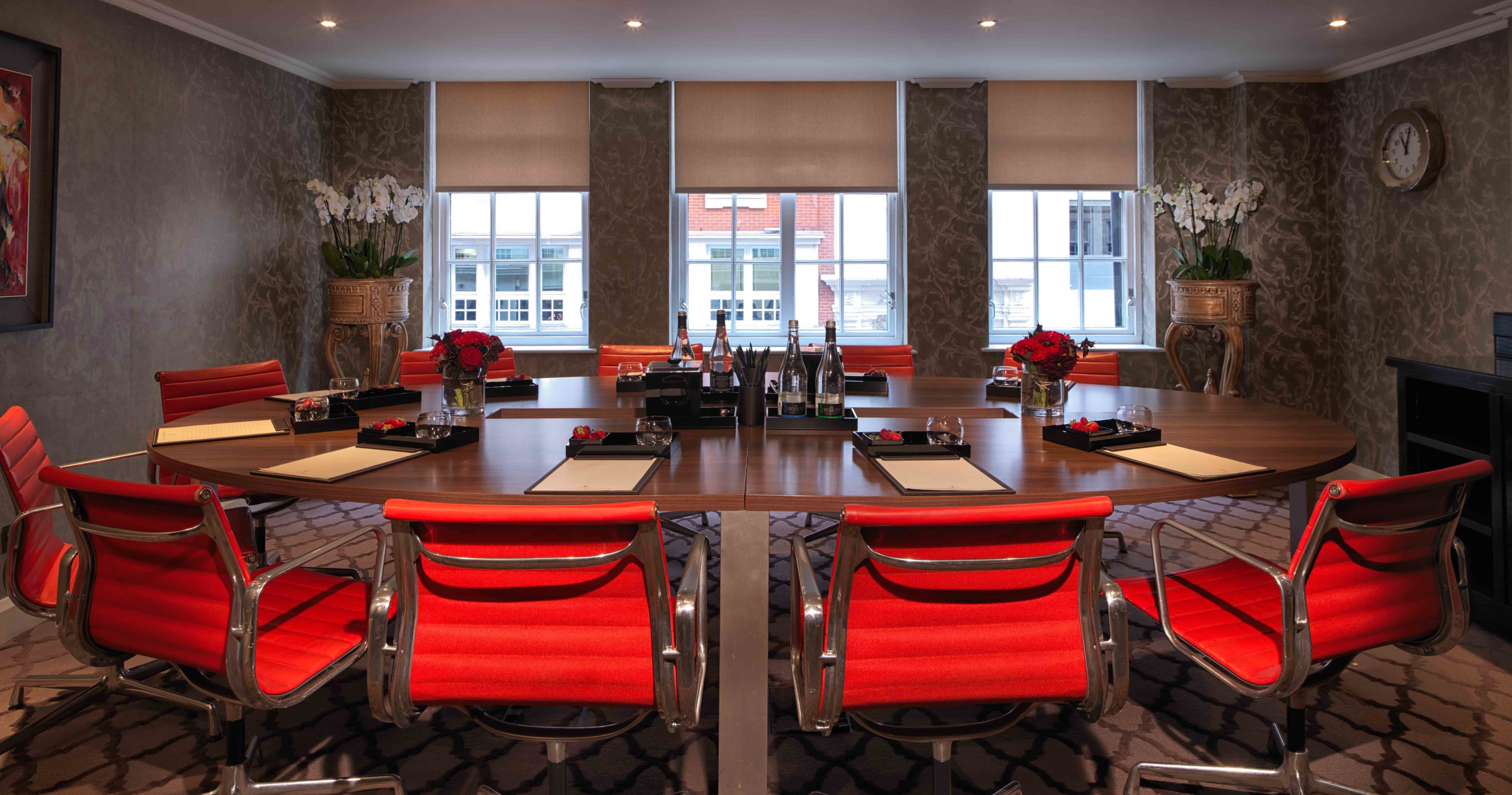 **Want a meeting room to hire in the most prestigious area of London? Welcome to Private Room 4 at The May Fair Hotel.** Private Suite 4 is individually designed in a signature colour to make the most of the natural daylight and contemporary design. The room can host a stylish boardroom for up to 10 delegates and is located in a private self-contained area on the mezzanine floor making it easy to hold separate meetings in close proximity. The May Fair Hotel is set in the heart of one of the most sought-after addresses in the world. The May Fair enjoys some of the largest bedrooms in London, including an iconic collection of suites, world-class food and drink in Mediterranean-inspired restaurant, May Fair Kitchen, a vibrant bar, secluded terrace, stunning event spaces and tranquil spa. Perfectly located close to Buckingham Palace, Bond Street’s exclusive boutiques and Berkeley Street’s famous restaurants, the hotel is moments from Green Park tube station, providing easy access to Canary Wharf.