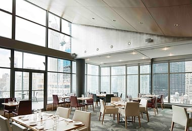 This FiDi private dining room has three spaces– the Pearl Room (max. 40), the Cedar Room (max. 30), and the Pearl + Cedar Combined (max. 80). Each room has round tables and light fixtures, with floor-to-ceiling windows. If you need more space, the 2,700 sq. ft. restaurant is available for a full buyout, hosting 125 seated guests or 300 standing.