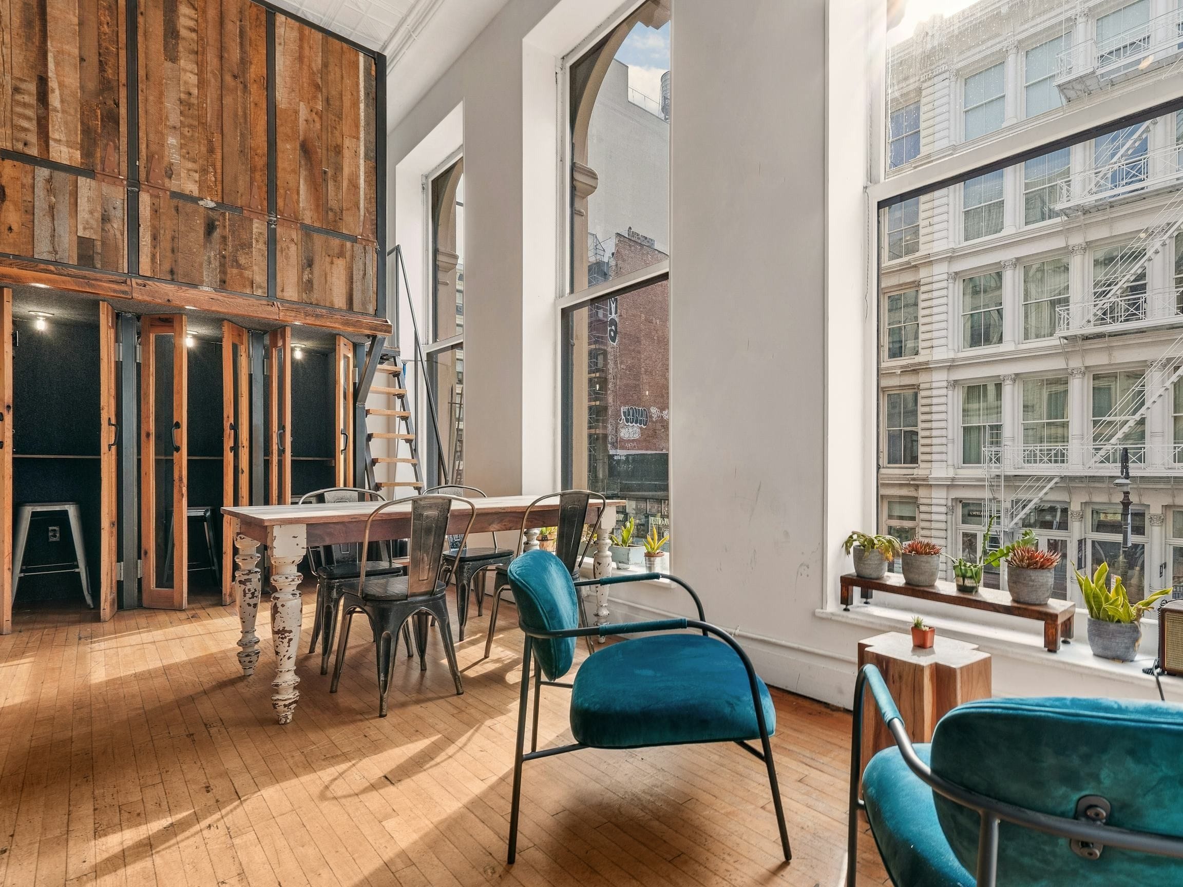 The SoHo Loft on Crosby Street is a prime New York loft hire for events. A multi-purpose 4,000-square-foot venue that’s suitable for various occasions, from corporate off-site meetings and conferences to product launches and intimate dinners. This flexible loft space includes a large main area equipped with a projector, screen, and AV capabilities. Enhancing its appeal are two 15 x 20 skylights, a full coffee bar, and facilities like a café conference area, breakout rooms, and private telephone cubicles.
