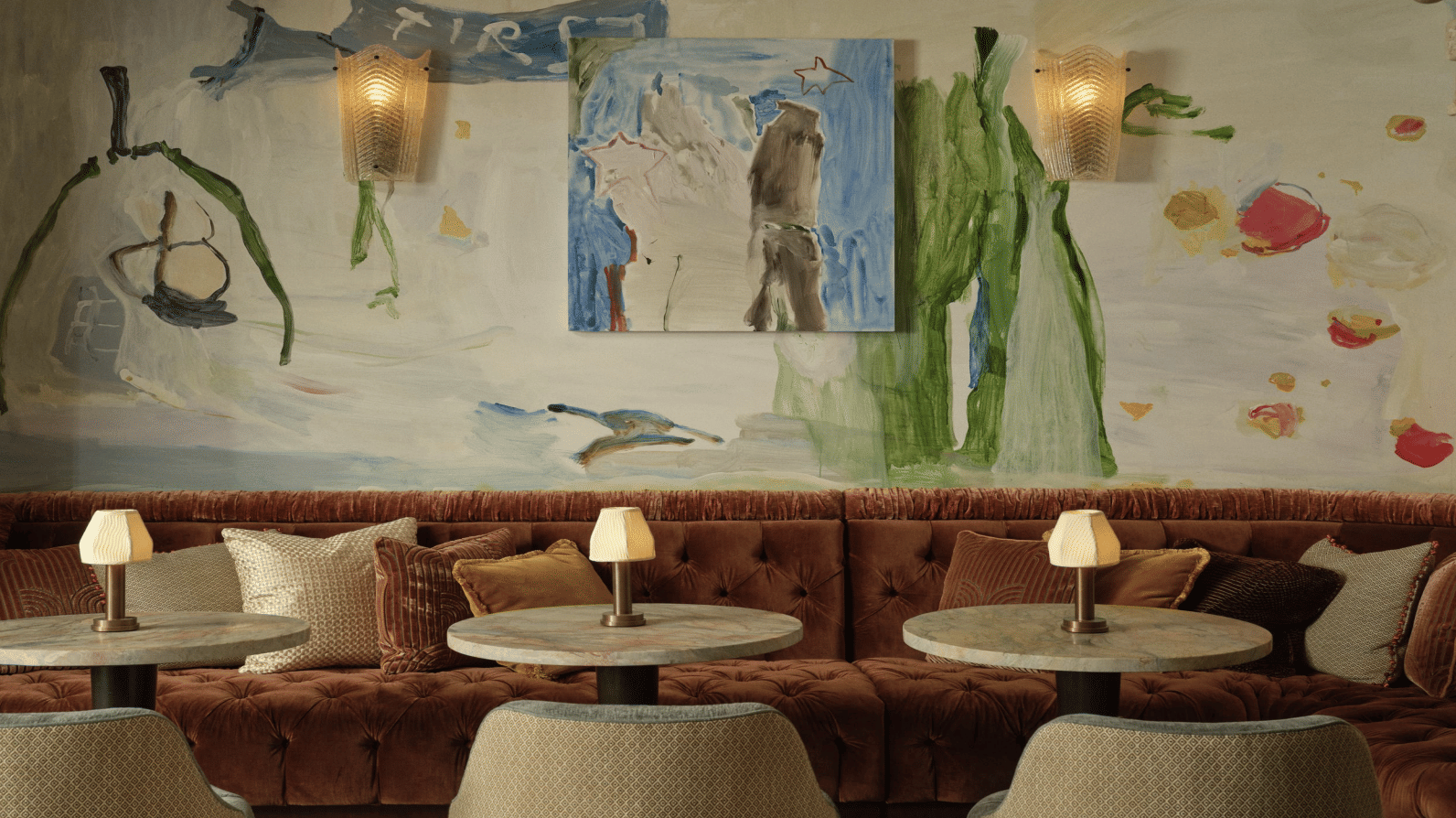 The Fireplace Snug is a cozy section of the Ned’s Club Downstairs, adjacent to the Atrium. With a fireplace sourced from a French chateau and colors inspired by the NYC sunset, it’s a warm, welcoming environment for private gatherings. The walls are decorated with a custom mural by Brooklyn-based artist b chehayeb, adding a creative flair to the space. Up to 20 guests can enjoy a seated dinner, choosing from two separate prix-fixe menus featuring everything from truffle mac and cheese to lobster rolls. The Snug can accommodate up to 30 guests for a standing cocktail reception, highlighted by seasonal and classic cocktails from the bar.
