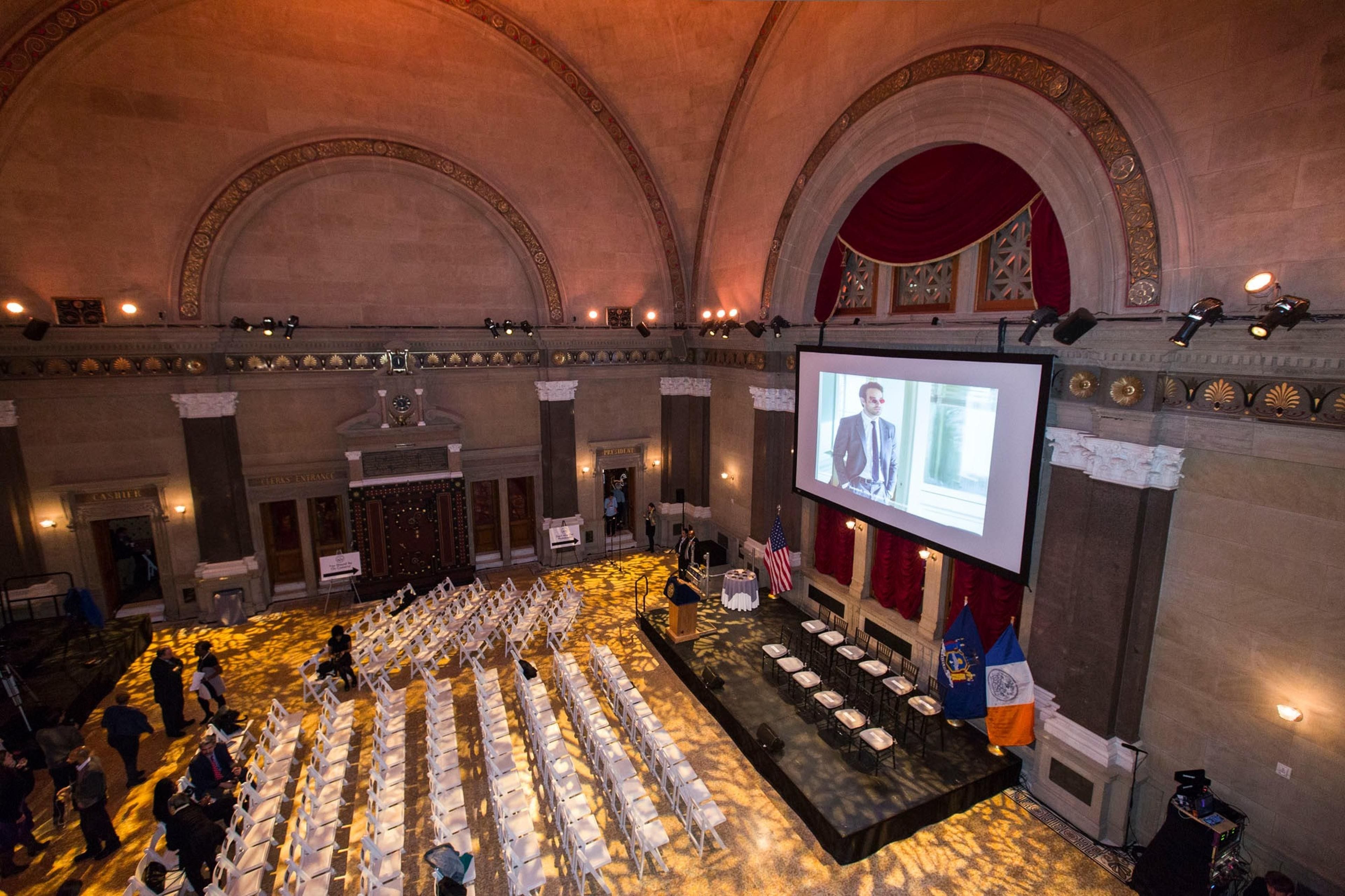 The Main Rotunda at Weylin is a breathtaking space that combines architectural grandeur with timeless elegance. Situated in the heart of this beautifully restored former bank building in Brooklyn, the rotunda serves as the centerpiece of the venue, showcasing its rich history and opulent design. With its soaring, domed ceiling adorned with intricate gold leaf details, the rotunda exudes an air of luxury and sophistication. The space is bathed in natural light through tall windows, creating an inviting and airy atmosphere. The marble floors, stately columns, and elaborate decorative moldings enhance the grandeur of the space, making it an unforgettable setting for any event. Whether hosting a lavish wedding, a high-profile gala, or an intimate gathering, the Main Rotunda offers a dramatic and awe-inspiring backdrop. Its seamless blend of classic architectural elements with modern amenities makes it a versatile space, where history and contemporary elegance come together to create an extraordinary experience
