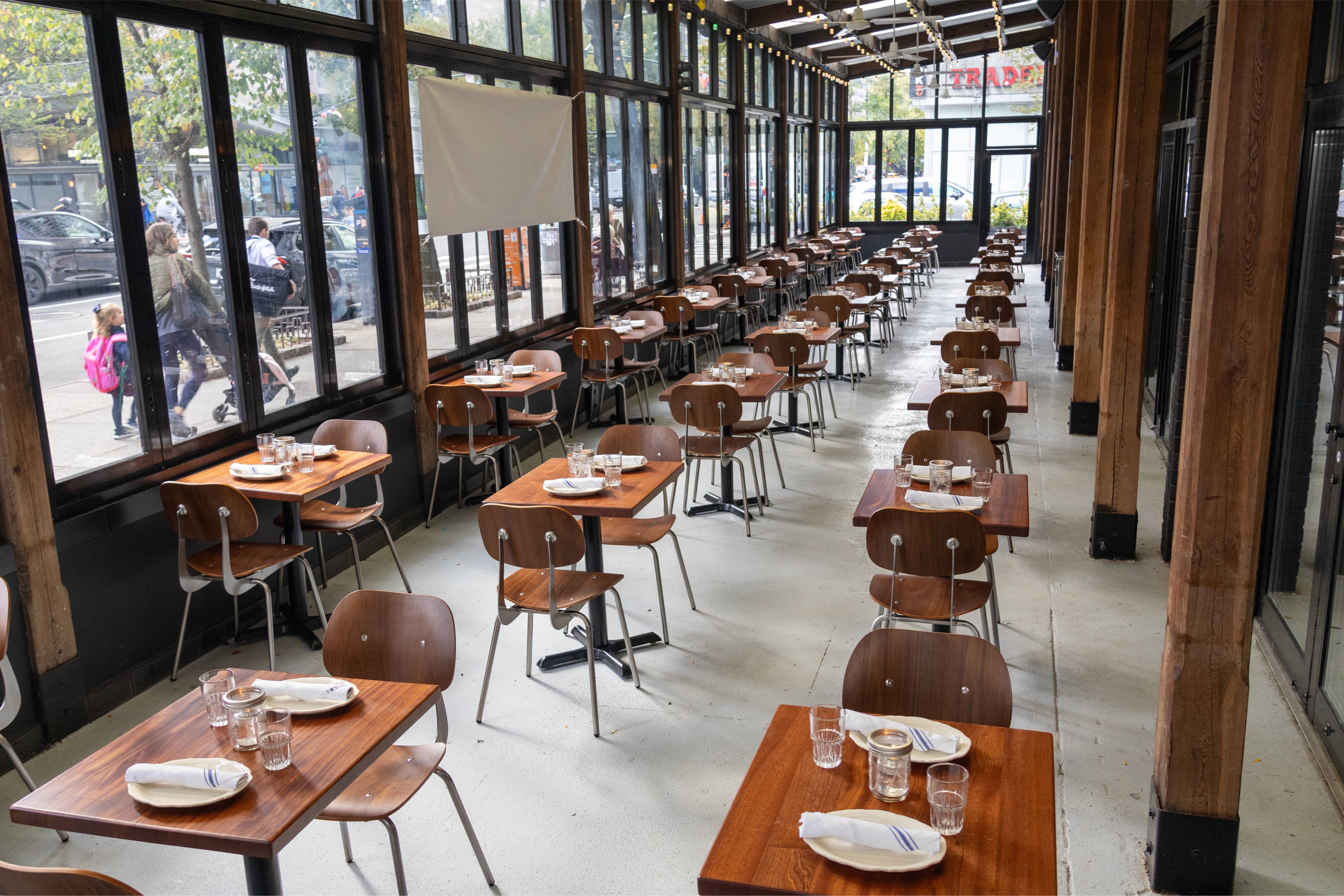 Space can be opened up completely in nice weather or stay fully enclosed. Perfect for seated dining or larger cocktail style events. The space is climate controlled and has it's own designated audio capabilities as well as a separate entrance if needed. Lots of natural light make this space appealing during the day or evening time. All furniture is easily moved and/or rearranged.
